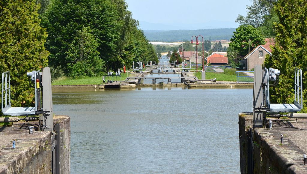 Je reprends la piste qui descends dans la vallée. Qui dit descente dit écluse. Et là, je tombe sur l’impressionnante échelle de 12 écluses de Valdieu-Lutran qui marque la ligne de partage des eaux entre le bassin méditerranéen et le bassin de la mer du Nord. Elle permet aux bateaux de franchir un dénivelé de 30 mètres sur 3 kilomètres !