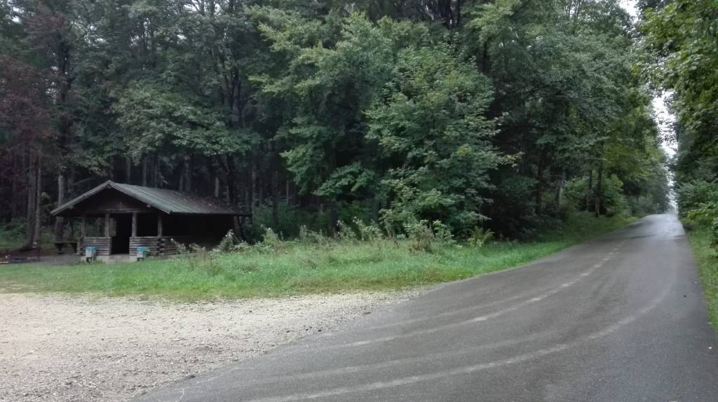 La nuit n’a pas été de tout repos ! Après avoir installé mon matelas et duvet sur le banc de l’abri forestier, le ciel s’est déchiré et la pluie s’est mise à tomber drue. De plus, malgré les boules Quiès, j’entendais les voitures, dont les occupants descendaient du mariage, passer à vive allure sur la petite route détrempée. Le réveil est difficile d’autant plus que le crachin et le froid ont fait leur apparition. J’ai également droit à la visite du cantonnier local qui vient changer les sacs poubelle (un dimanche ?). Même un mulot s’est invité cette nuit et a grignoté mon pochon dans lequel je range ma popote !
