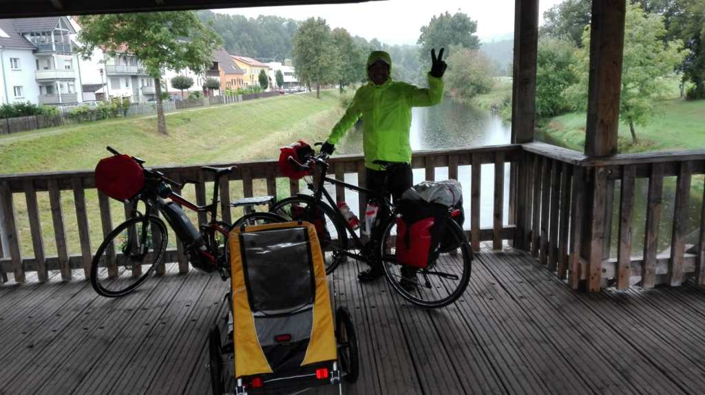 Je sors mes vêtements chauds et de pluie et j’attaque la descente à 15% pour arriver à Tuttlingen où, une fois encore, je me plante. Sans aucun panneau EV6, je suis un itinéraire vélo qui me conduit dans la périphérie de la ville. Je retourne dans le centre-ville pour retrouver le Donau et l’EV6 … et Pierre qui attend au feu à gauche du carrefour le long du Danube. Quelle surprise ! Nous repartons donc ensemble sous une pluie fine qui s’accentue au fil de de la matinée.