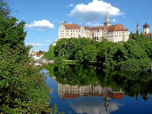 Vers midi, fourbus et trempés, nous décidons de nous arrêter à Sigmaringen (superbe château perché) pour déjeuner dans le restaurant Traube bien bondé. La piste empruntée ce matin est considérée comme la plus belle du Donau-Radweg bavarois. (Lexique : Donau=Danube, Rad=roue, Weg=chemin, Radweg=piste cyclable, Fahrrad=vélo). Sous la pluie, le charme n’est malheureusement pas le même.