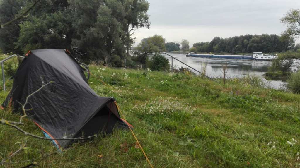 Magnifique nuit étoilée et pleine lune lorsque je me suis levé (à poil) vers minuit pour le pisse-tisane. Puis réveil avant 7h. La tente est trempée mais je ne dois pas traîner pour retrouver Pierre. A 8h tapante, je le rejoins avec grand plaisir et nous repartons pour une longue journée, Pierre devant retrouver sa compagne à Passau aux portes de l’Autriche.