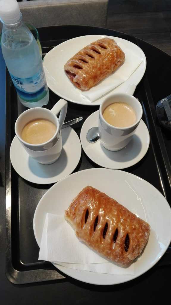 Les nuages s’évaporent et le soleil refait son apparition. Les kms défilent plus vite à deux. D’ailleurs je remarque que Pierre se confie un peu plus. Je trouve un magasin de vélos où j’achète mes patins de frein. Nous nous arrêtons déjeuner devant une plage en bordure de Danube et prenons un café au prix salé (2,50€) sans parler de la bt de 0,33cl d’eau gazeuse au même prix.