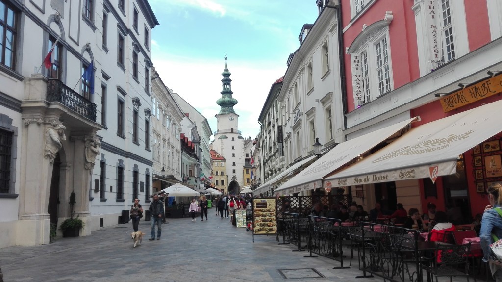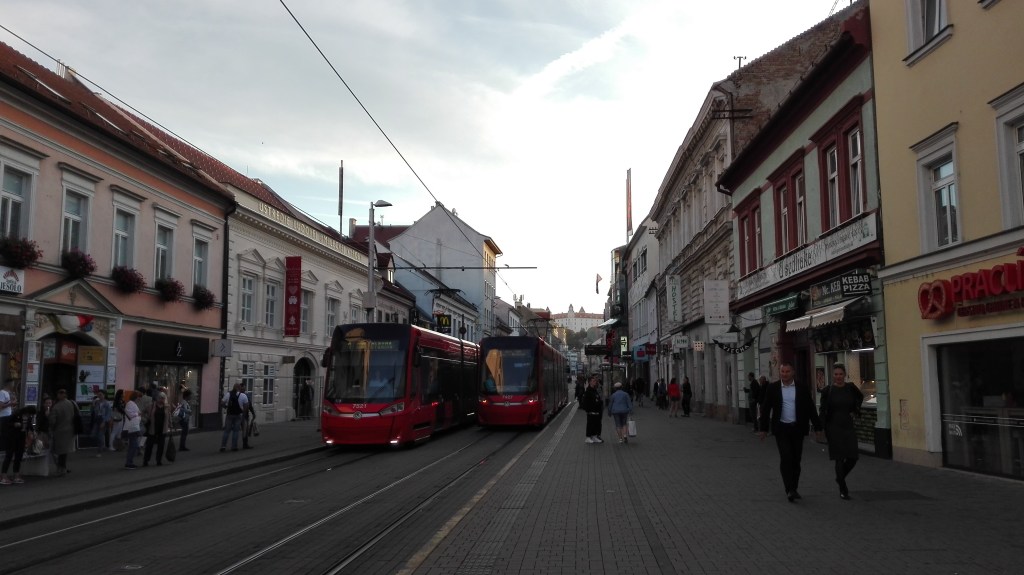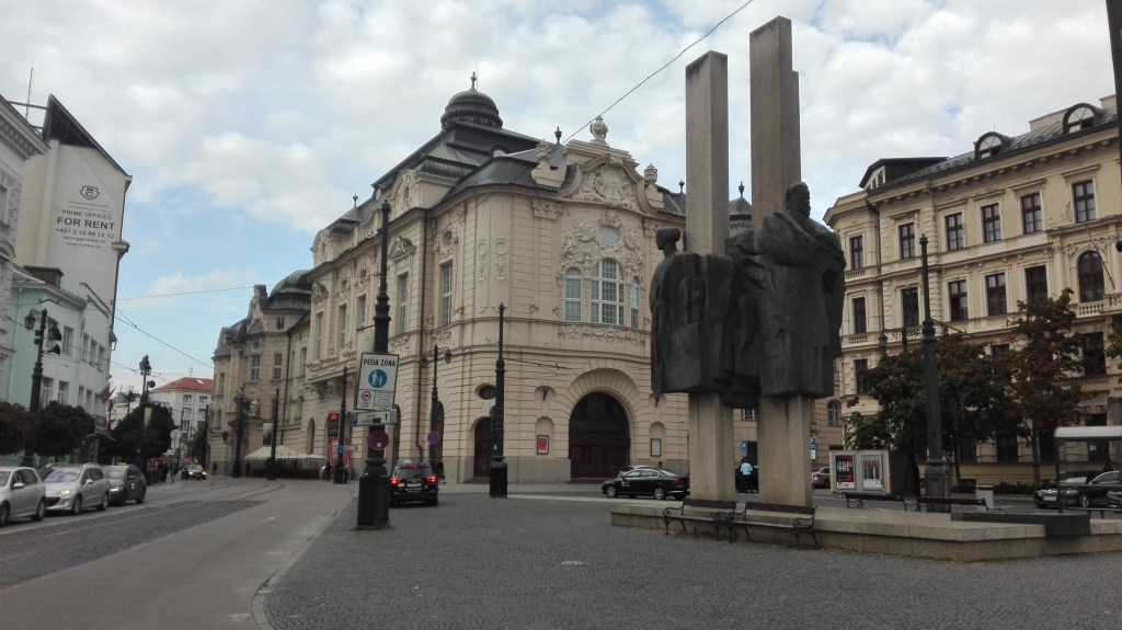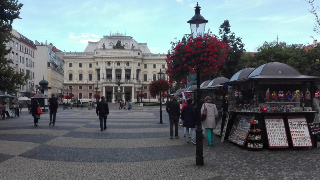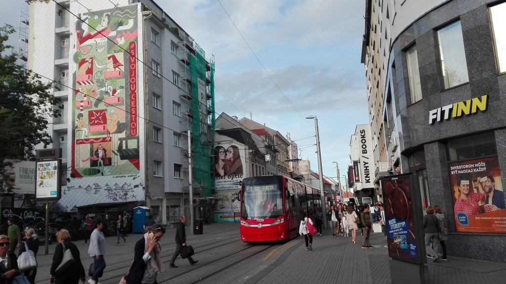 Le choc est d’autant plus important que, en arrivant à Bratislava, les pistes cyclables deviennent rare, le revêtement chaotique, les maisons tristounettes, les trams vieillissants et le temps maussade ! Après avoir jardiné un peu pour trouver mon hôtel (Freddie) perché en haut de la colline qui domine le centre-ville et une grosse frayeur quant à ma réservation (2 hôtels du même nom dans le quartier), je monte à ma chambre (très correcte pour 28€), pose mes sacoches, prends une bonne douche et repars en expédition en milieu d’après-midi. Je trouve cette ville vraiment atypique en pleine modernisation mais au charme tellement suranné.
