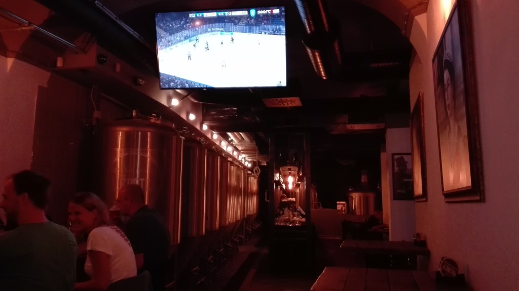 En début de soirée, je trouve une brasserie très sympa où je dîne pour 10€ d’un poulet accompagné de gnocchis maison et sauce aux champignons accompagné d’un 1/2l de bière. Tout cela en regardant un match de hockey du championnat slovaque …