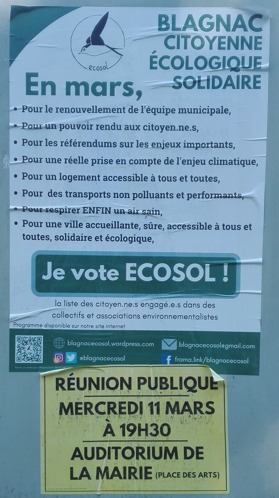 En politique tout d’abord où je rejoignais la liste conduite par la pugnace et visionnaire Marie-Pierre que je cotoie depuis de nombreuses années au sein d’association environnementale (ABAVE) et militante pour les modes doux (2P2R et AUTATE). Cette liste avait pour objectif de proposer une vision novatrice, écologique, solidaire et citoyenne de la gestion municipale et attaquer aussi ce bastion qu’est la mairie blagnacaise détenue depuis des décennies par des potentats locaux et, ce, au sein d’une liste hétéroclite de personnes venues majoritairement du monde associatif. Cette liste dont le symbole est l’hirondelle, disparue depuis des années avec l’augmentation des produits chimiques, insecticides et pesticides, et le doux nom est ECOSOL pour « Liste Citoyenne, Écologique et Solidaire ». Ce furent des semaines intenses de réunions, de débats, de discussions, d’engueulades aussi où, à partir d’une feuille blanche, il nous fallait bâtir tout un programme et convaincre le plus grand nombre de citoyen.nes à partager nos idées. Mais que de belles et riches rencontres durant ces semaines ô combien animées ! Las, ce foutu virus s’invita à la fin de la campagne et perturba le scrutin. En effet, le maire sortant fût réélu, à 45 voix près, dès le 1er tour mais ne rassemblant qu’un électeur inscrit sur 5 (soit 20% des suffrages avec un taux d’abstention avoisinant les 60%). Quant à nous, 15% des électeurs nous firent confiance, plaçant notre liste en 3è position avec 2 élu.es au Conseil Municipal mais aucun hélas au Conseil Métropolitain. Résultat ô combien honorable mais me laissant une désagréable pointe d’amertume au vu du scrutin du 15 mars et des risques pris par tous …