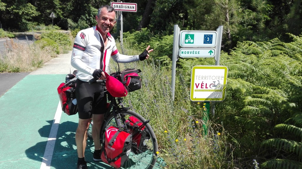 Nous arrivons en début d’aprèm’ à Gradignan et croisons la piste de l’EuroVélo3 (Espagne-Norvège). Serait-ce un signe du destin ? Je le saurais dans quelques semaines.