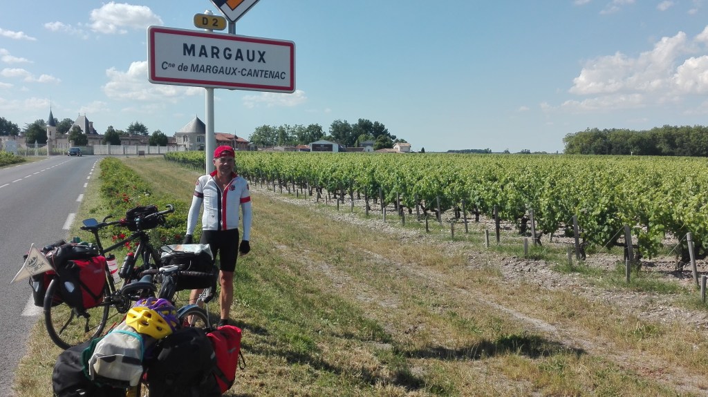 La partie entre Bordeaux-lac et les premiers vignobles du Margaux est pénible. Un méchant vent de 3/4 face s’est levé et la chaleur est toujours là. 34°c au Garmin de Vincent. Ça cogne dur. Le bitume fond par endroit. Heureusement, nous arrivons dans le vignoble et de grands arbres en bordure des magnifiques demeures nous font de l’ombre.
