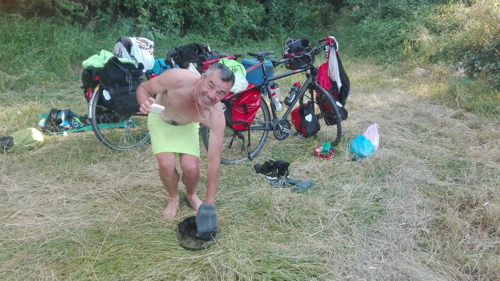 Après une bonne nuit de sommeil, réveillé par le bruit et l’odeur, non pas du marteau-piqueur, mais d’un pic-vert et des humides senteurs. Pas trop de courbature. Un peu mal au fessier. Normal après 3 mois sans vélo si ce n’est pour me balader dans Blagnac. Nous plions les gaules et partons de notre plage de sable blanc en direction de Gradignan.