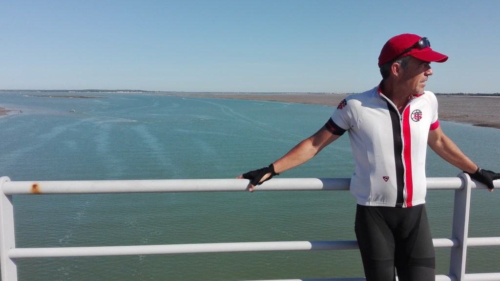 Nous empruntons à nouveau la VélOdyssée et roulons hors circulation sur une belle piste cyclable en forêt. Nous avons décidé ce matin d’aller faire le tour de l’île d’Oléron. Après avoir traversé la Seudre, nous arrivons en vue de l’île, tout du moins la presqu’île puisqu’un pont la relie au continent.