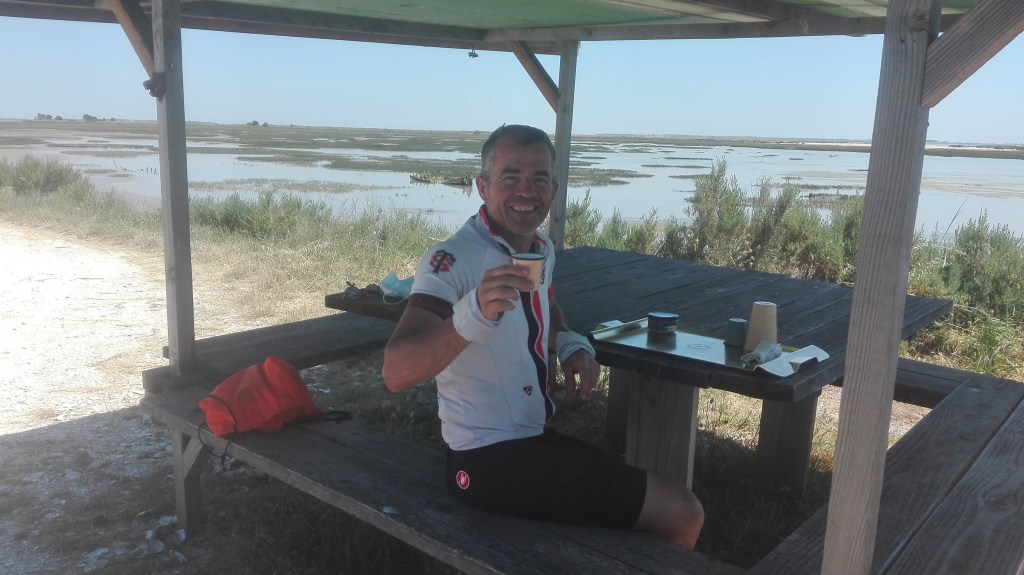 Les kilomètres défilent, l’heure avance. Il nous faut trouver un bivouac pour cette nuit. Après avoir rempli la vache à eau au dernier cimetière sur notre itinéraire, nous nous enfonçons dans la forêt domaniale de St-Trojan en empruntant « la piste de défense des forêts contre l’incendie ». C’est large, ça monte et ça descend. De nombreuses pistes partent de tous les côtés mais impossible de trouver un endroit sympa pour bivouaquer. A part un chevreuil et quelques promeneurs, c’est inhospitalier. Nous jardinons 45’ avant de trouver enfin un endroit où planter nos tentes. Ce n’est pas le pied mais ça ira. Il est déjà tard et il nous faut dîner; les huitres c’est bon mais ça ne nourrit pas son cycliste ! Et dire qu’en allant pisser en fin de soirée, j’aperçois à 200m d’où nous sommes, une superbe clairière tant recherchée. Dommage … Il est tant de faire dodo. Vincent reprendra sa route pour rentrer à Toulouse via la Dordogne et j’aurais pas mal de choses à finaliser …