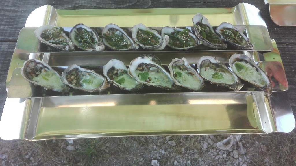 Mais lorsque nous arrivons sur place, quel enchantement ! Accueilli par l’affable patron qui nous annonce que nous sommes ses premiers clients (nous aurons droit à l’apéro, un délicieux Pineau, offert), nous rentrons dans la cabane qui, de l’extérieur ne paie pas de mine, mais est très bien arrangée à l’intérieur. Il nous faut choisir entre les différentes spécialités d’huîtres nature, froide, chaude. Nous commandons également une terrine d’anchois au piment d’Espelette pour accompagner l’apéro. Puis arrivent nos huîtres froides, mais cuisinées, accompagnées d’un vin blanc d’Oléron : un délice ! Ensuite assiette de gambas. Puis huîtres à la framboise, chocolat et gâteau salé en dessert. Nous repartons enchantés quoique Vincent, qui tenait à m’inviter, ait trouvé l’addition iodée …