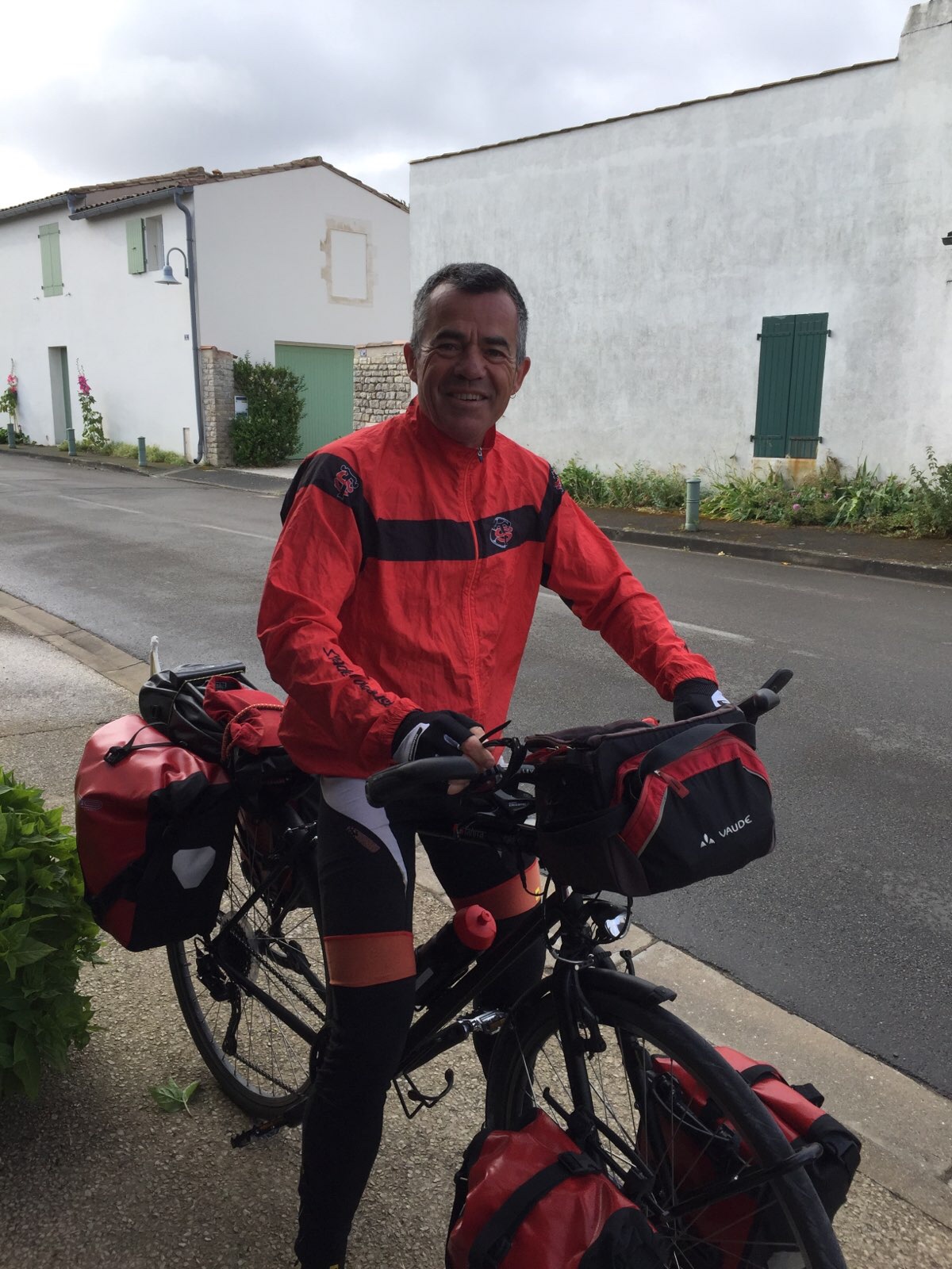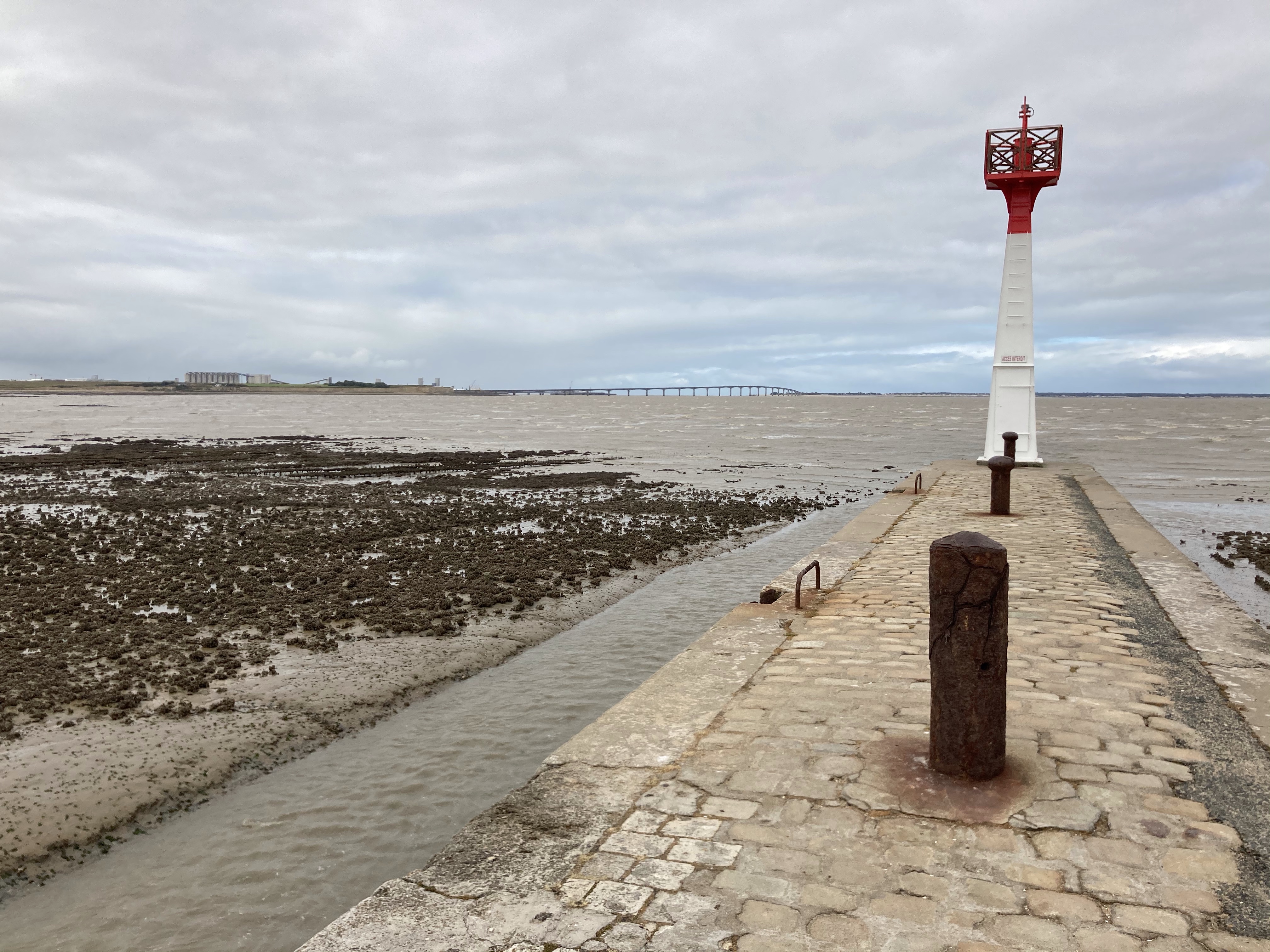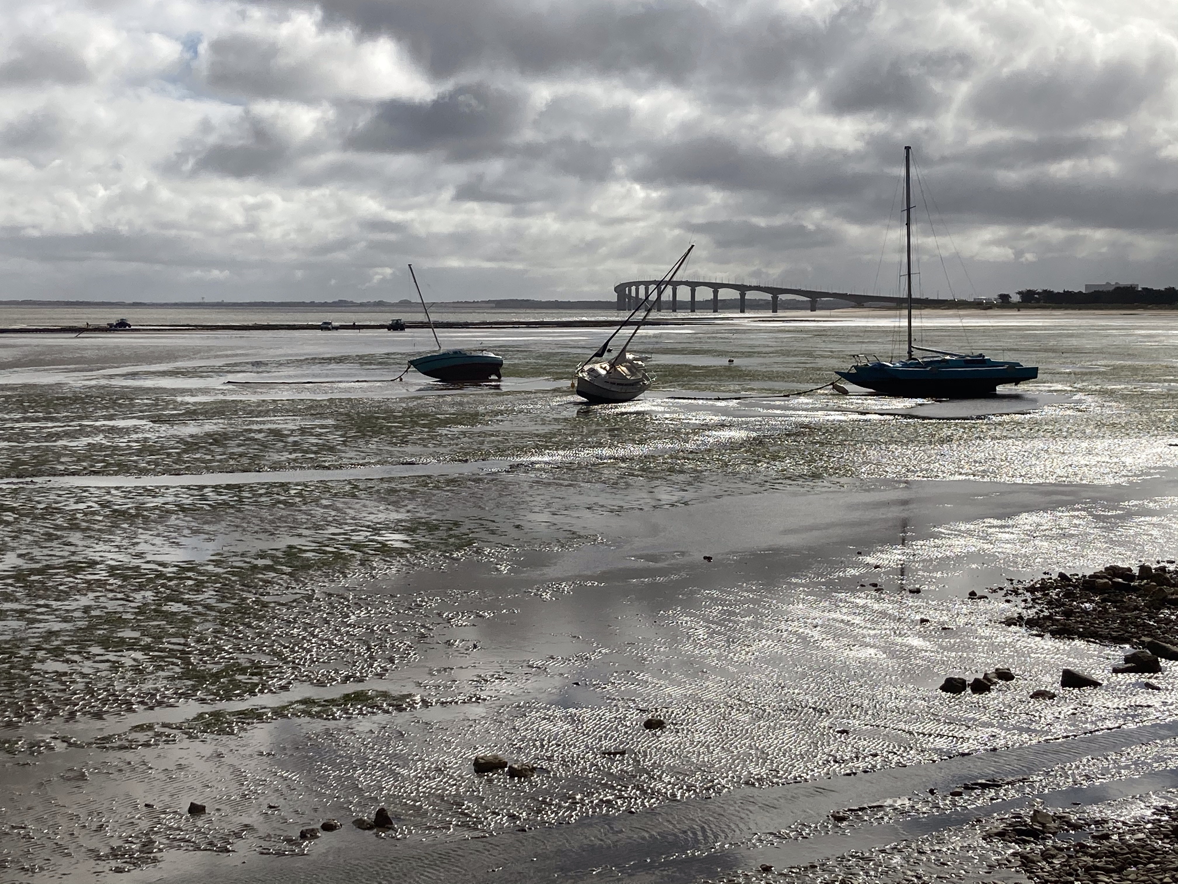 Comme j’ai pu charger Géovélo sur mon nouveau joujou, je vais tester en grandeur nature si ça fonctionne bien. Me voilà parti à suivre le point qui devra me mener aux Sables. Par contre, la météo a changé : la température n’est plus que de 15°c, le ciel est bas, la pluie s’est invitée et surtout le vent qui souffle fort de N-O, pile-poil dans ma direction. La journée risque d’être coton … Je quitte donc à regret l’île de Ré pour rejoindre le continent.
