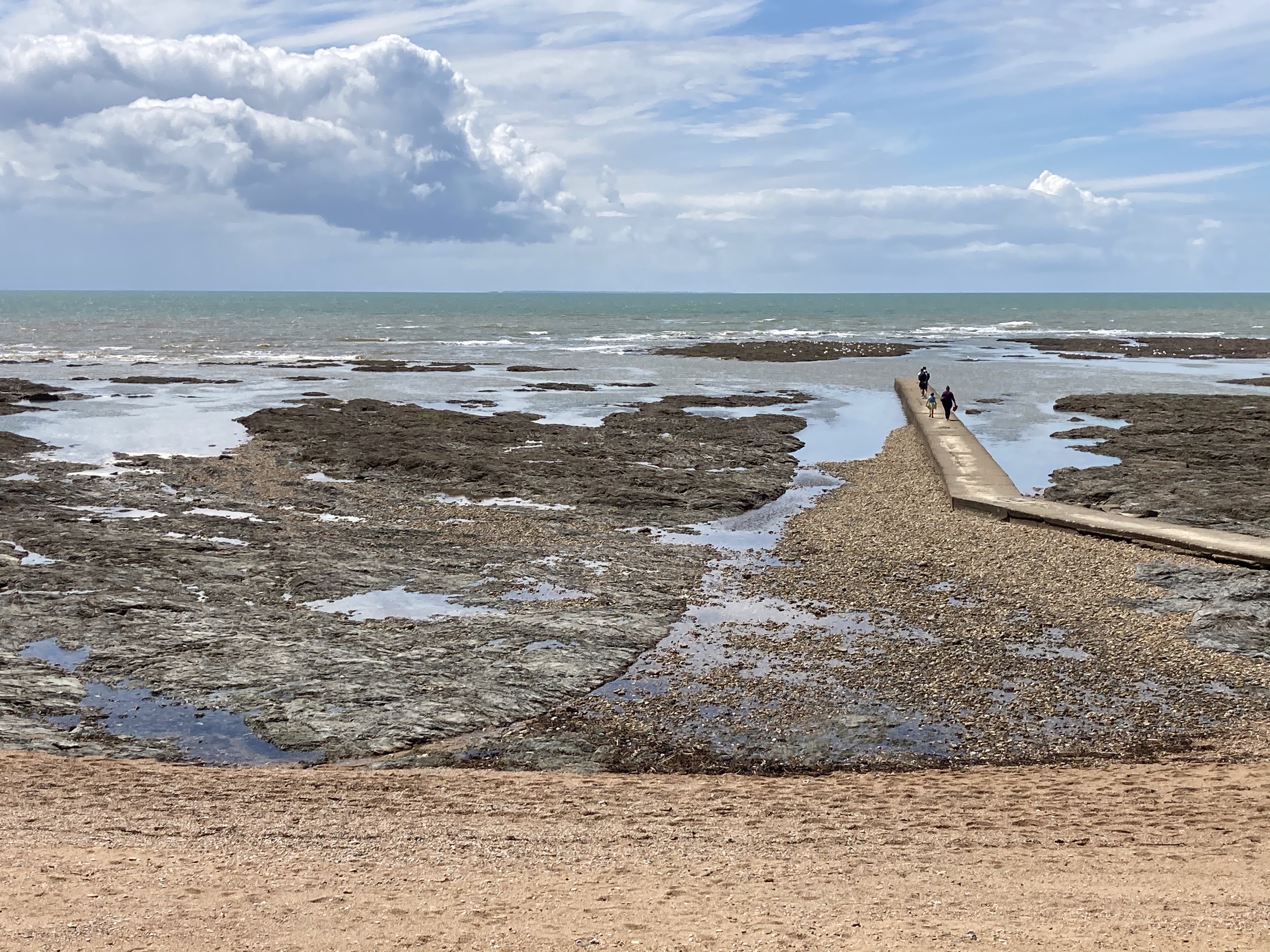 Il est 13h30 et il fait faim ! Je trouve un banc en frond de mer avec vue sur l’île d’Yeu au loin. C’est l’étale. Des couples se baladent main dans la main sur la digue. Je suis seul mais serein.
