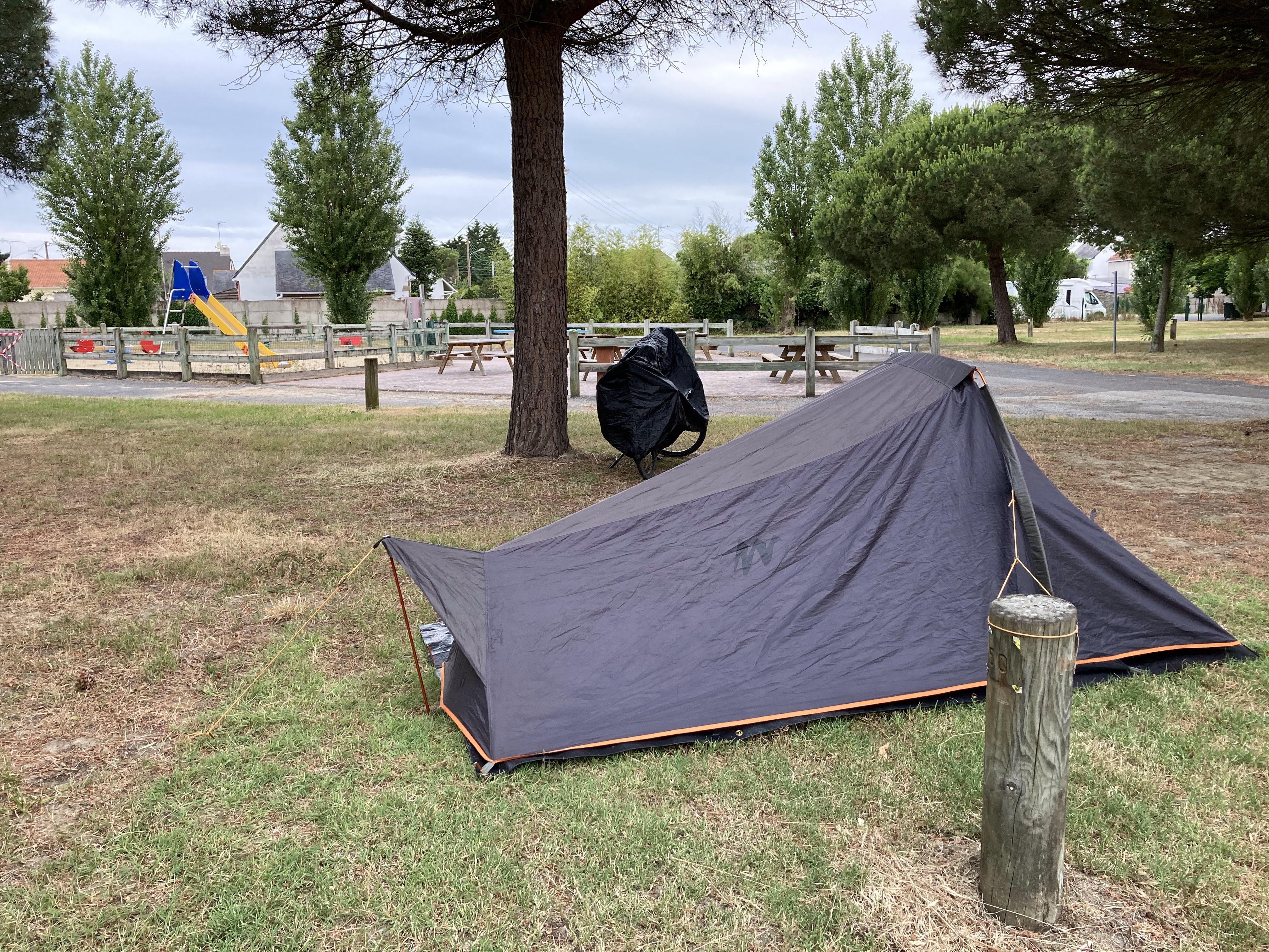 Bon allez j’arrête et retourne à mon propos. Donc je reprends la route un peu perturbé tout de même et j’arrive dans Pornichet. J’hésite à m’arrêter dans un camping vu que la météo est clémente et mes bidons pleins. Je décide donc de continuer et de trouver un endroit où bivouaquer sans consulter mes cartes. Mauvaise pioche ! Après Pornichet, La Baule-les-Pins puis La Baule-Escoubiac puis Le Pouliguen et pas un seul endroit où planter ma tente. Il est bientôt 20h et je vois un panneau « camping » que je suis. Le 1er qui est le municipal est fermé. Le 2nd aussi fermé mais je peux quand même rentré mon vélo. Nobody. Tant pis. Je repère les sanitaires, fais couler l’eau et en plus elle est chaude. Yes ! Je plante ma tente et on verra bien. Je suis seul sur ce camping et ce n’est pas pour me déplaire. Demain il fera jour. Je dîne de mes derniers restes. Mes provisions sont presque épuisées. Il va falloir que je me ravitaille. Peut-être tiendrai-je jusqu’à Carnac que je pense atteindre jeudi soir si je continue à suivre la côte.