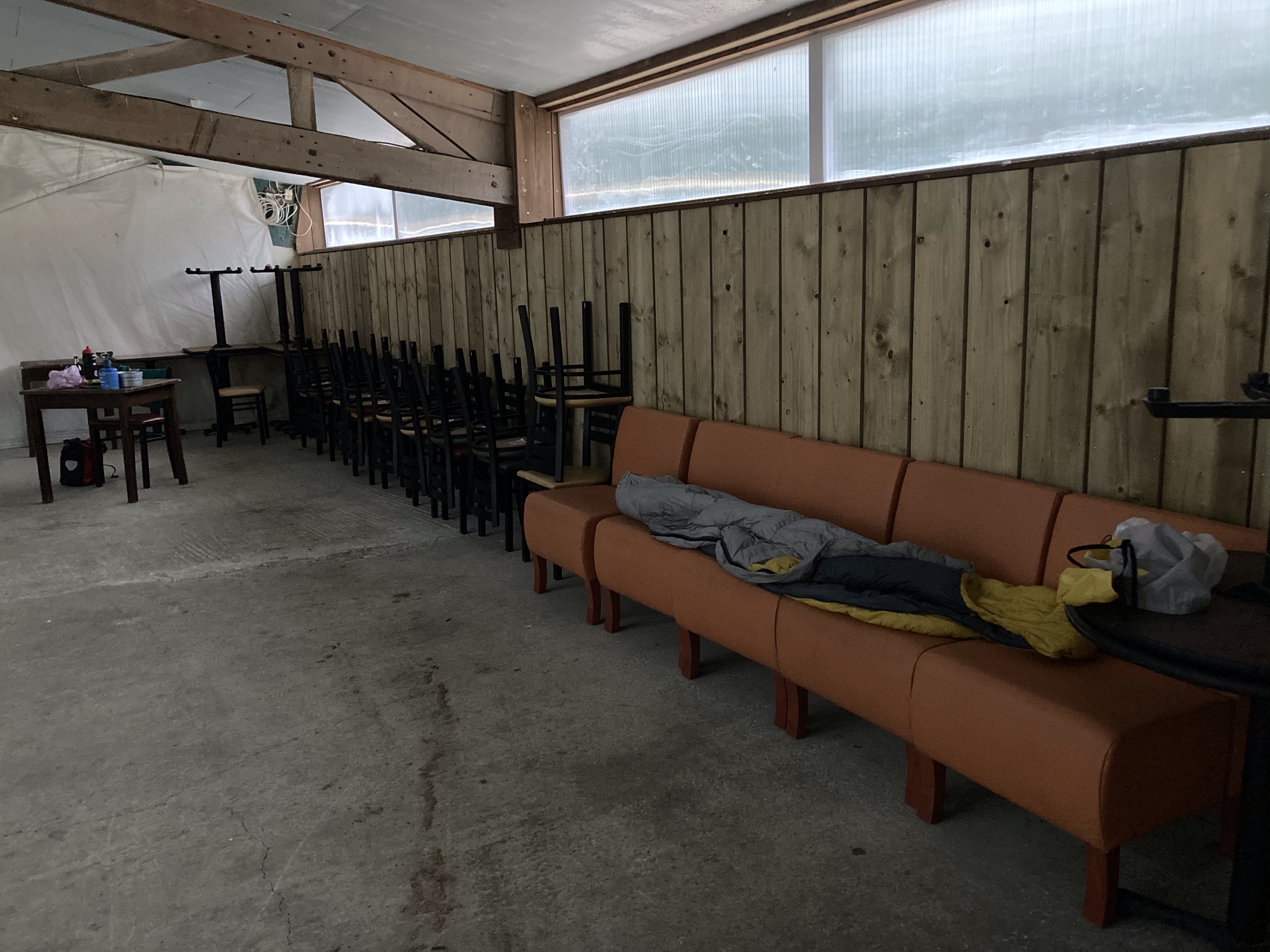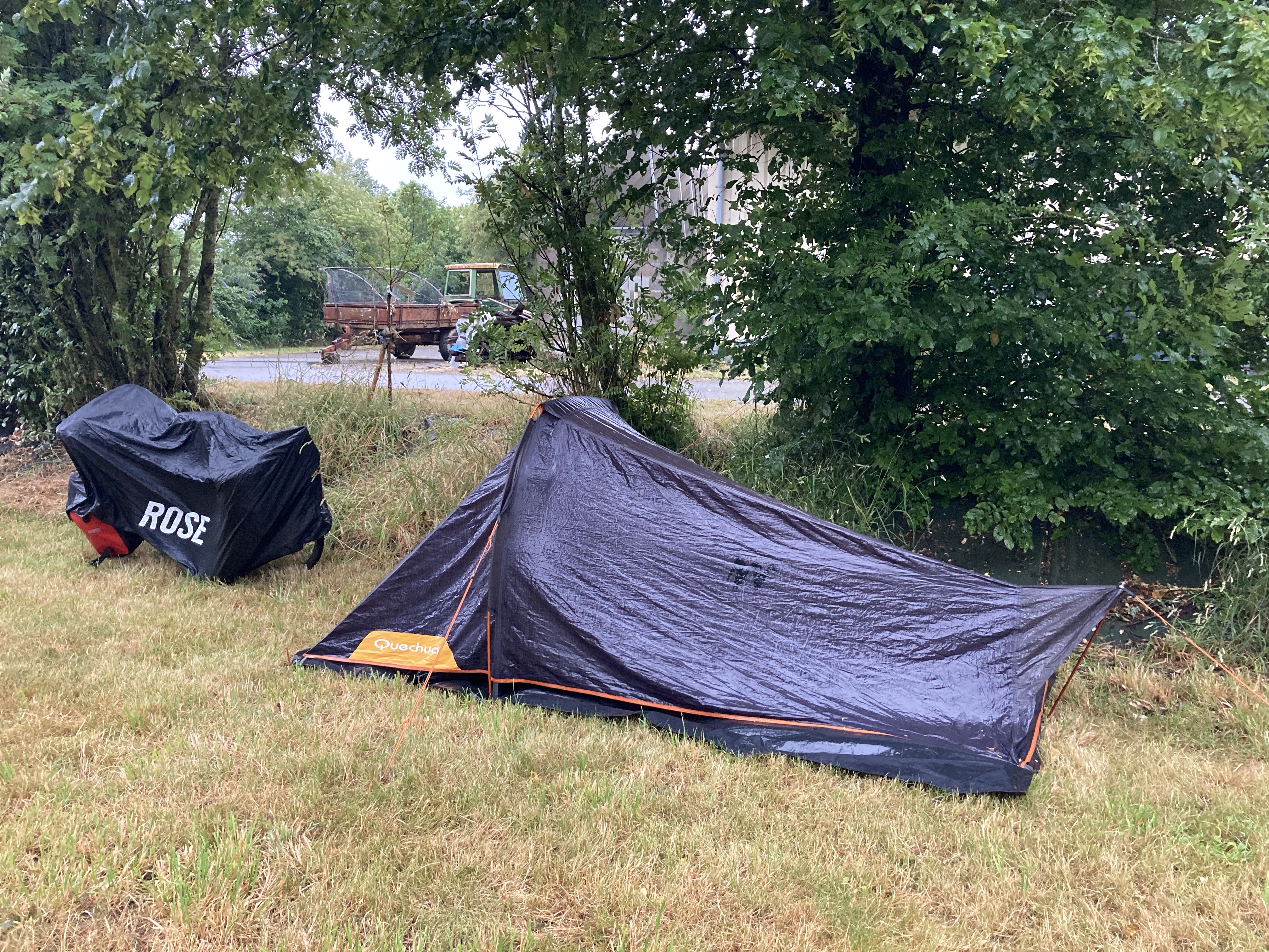 Le matelas gonflable baignait dans l’eau et il me fallait réagir rapidement. J’imagine l’angoisse des personnes qui subissent des crues ou, pire, les marins dont le bateau prend l’eau. Terriblement angoissant. Mais bon, relativisons. J’avais la chance d’avoir un endroit sec où m’abriter. Donc je sors ma frontale, m’habille en catastrophe, range mon duvet dans son sac-compresseur, remplis mon sac imperméable (acheté au Vieux Campeur avant de partir et dans lequel je mets ma tente+bâche pliées sur mon porte-bagage) de mes vêtements/livre/duvet, prends le matelas gonflable sous le bras et ma sacoche-bureau à l’épaule et fonce m’abriter dans le bâtiment principal du camping. Je verrai au lever du soleil pour rapatrier la tente et mon vélo bien abrité sous sa bâche « Rose ».