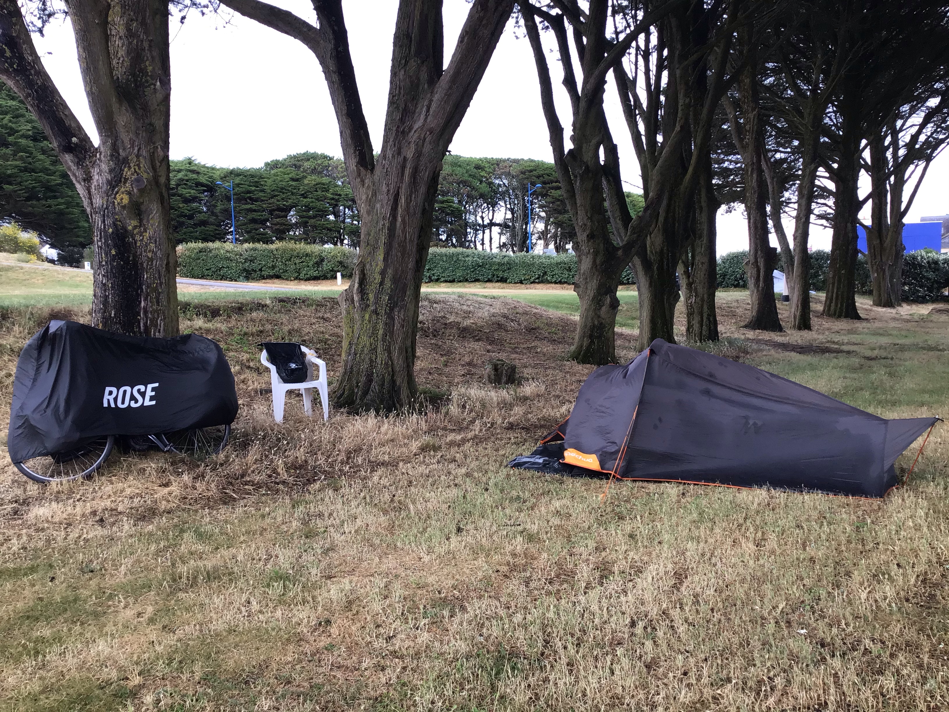 Puis j’arrive dans la jolie bourgade d’Etel où, en ce samedi ensoleillé, de nombreux badauds se baladent dans les petites rues commerçantes. Cependant, le ciel s’assombrit salement sur la mer et le vent ramène ces gros nuages menaçant. Il n’est que 17h et je voulais continuer ma route jusqu’aux portes de Lorient mais vu la menace et le discours des marins sur le port, je prends la décision de rejoindre au plus vite le camping municipal repéré à l’aller. Le temps de comprendre que les sanitaires et les mobil-homes sont encore fermés, les gros nuages noirs sont déjà là. Je me hâte de monter la tente, de prendre quelques affaires et de couvrir le vélo alors que l’orage éclate. Je pensais pouvoir m’abriter sous un auvent mais les petits mobil-homes en sont dépourvus. La fin d’après-midi va être longue. Je m’abrite sous mon toit incertain en attendant qu’une accalmie arrive pour dîner rapidement avant de repartir à l’abri.
