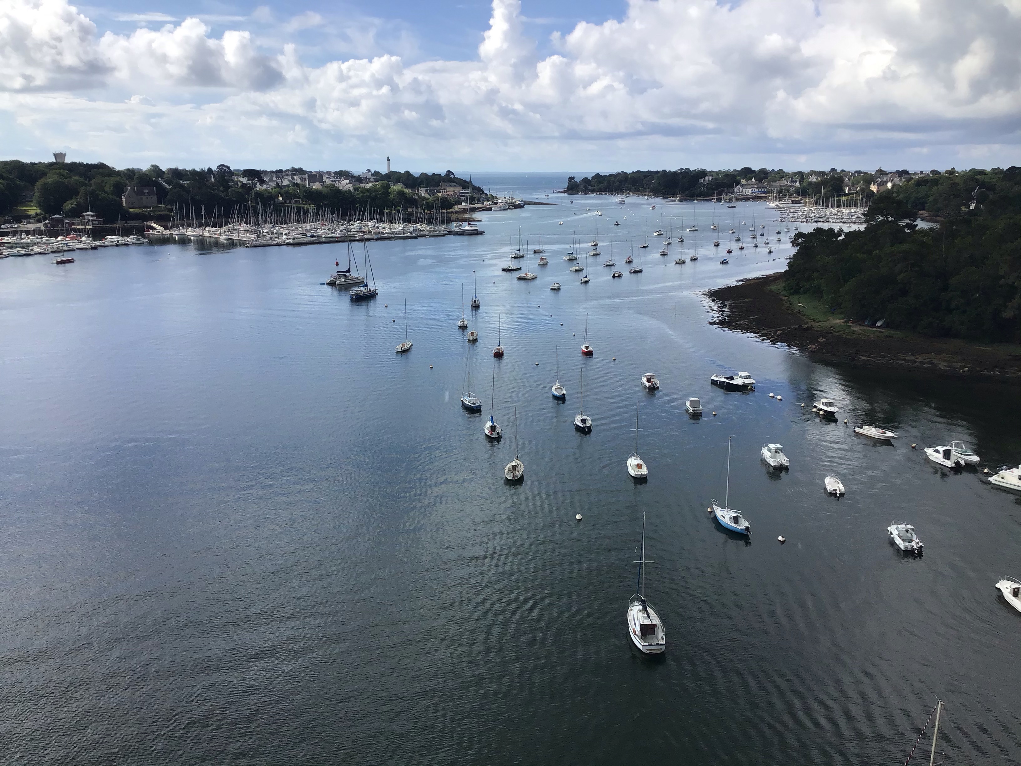 Par contre, le bac qui traverse l’Odet est lui aussi fermé. Je dois donc à nouveau faire le tour de la baie et de emprunter le pont qui traverse ce ria mais qui me permet d’admirer la vue magnifique sur la baie. Un des avantages du vélo est de pouvoir s’arrêter où on veut, quand on veut. Et, vu les contrastes de couleurs, je me régale à m’arrêter prendre des photos.