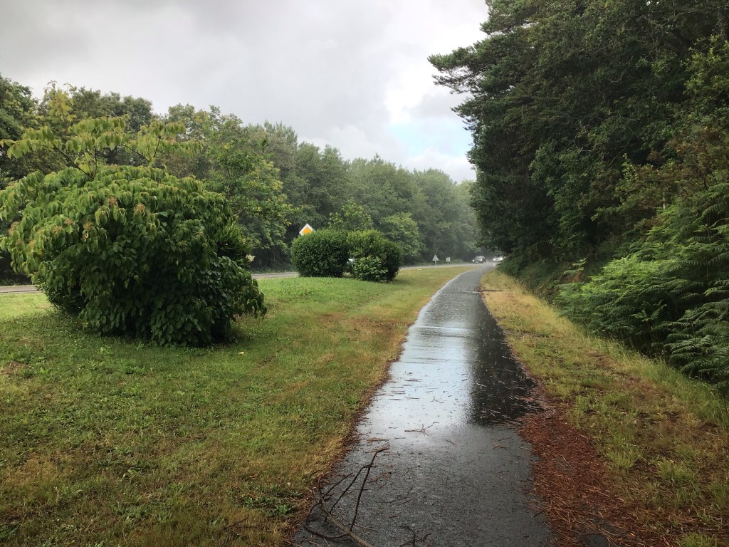 A peine le point franchi et alors que je cherche la direction de Ste-Marine (une petite pensée aussi à mon ex-belle fille), un déluge s’abat soudain. J’ai juste le temps de trouver un abri sous une frondaison et d’attendre que ce nouveau grain passe. C’est hallucinant comme cela éclate rapidement. Ce doit être le rite de bienvenue en pays Bigouden.