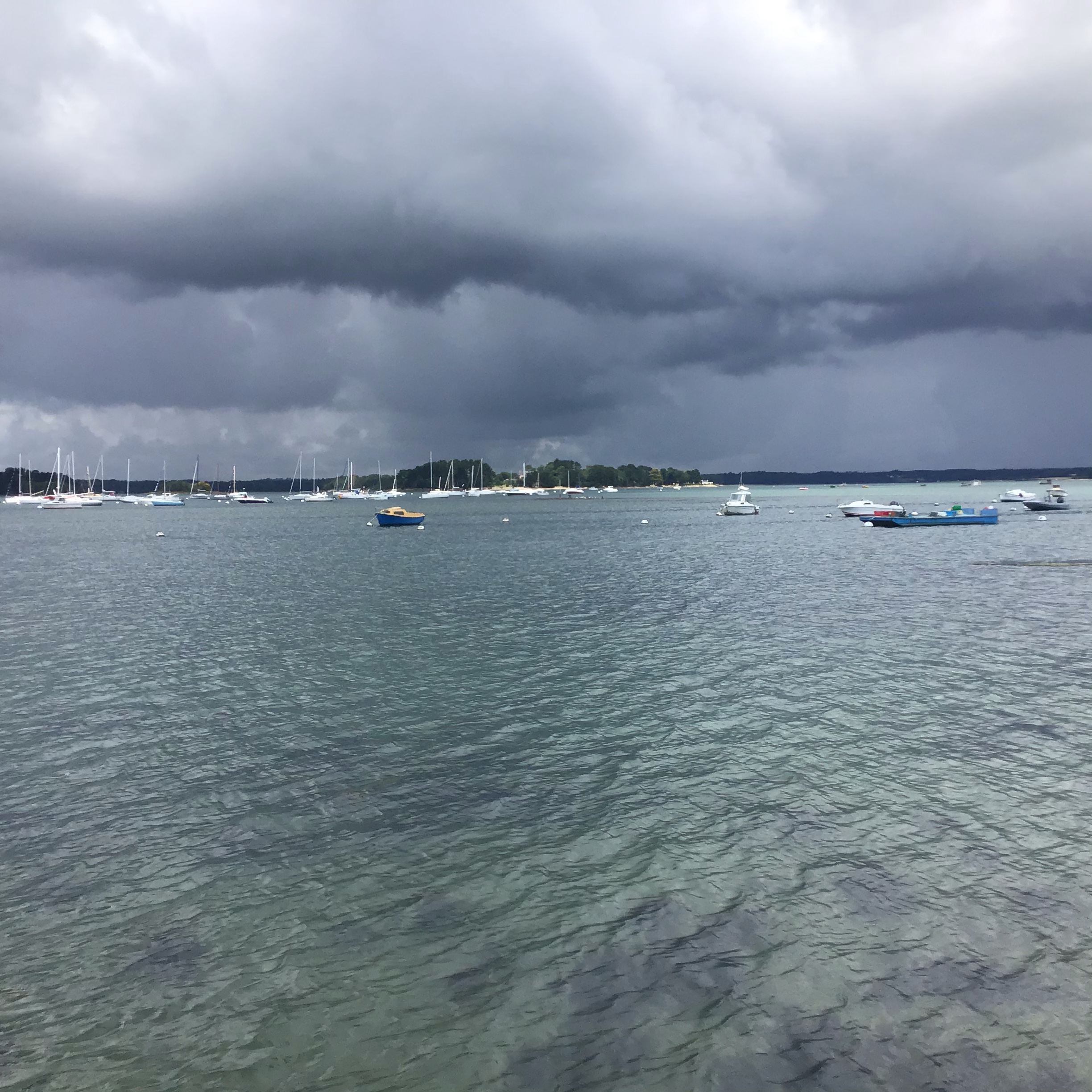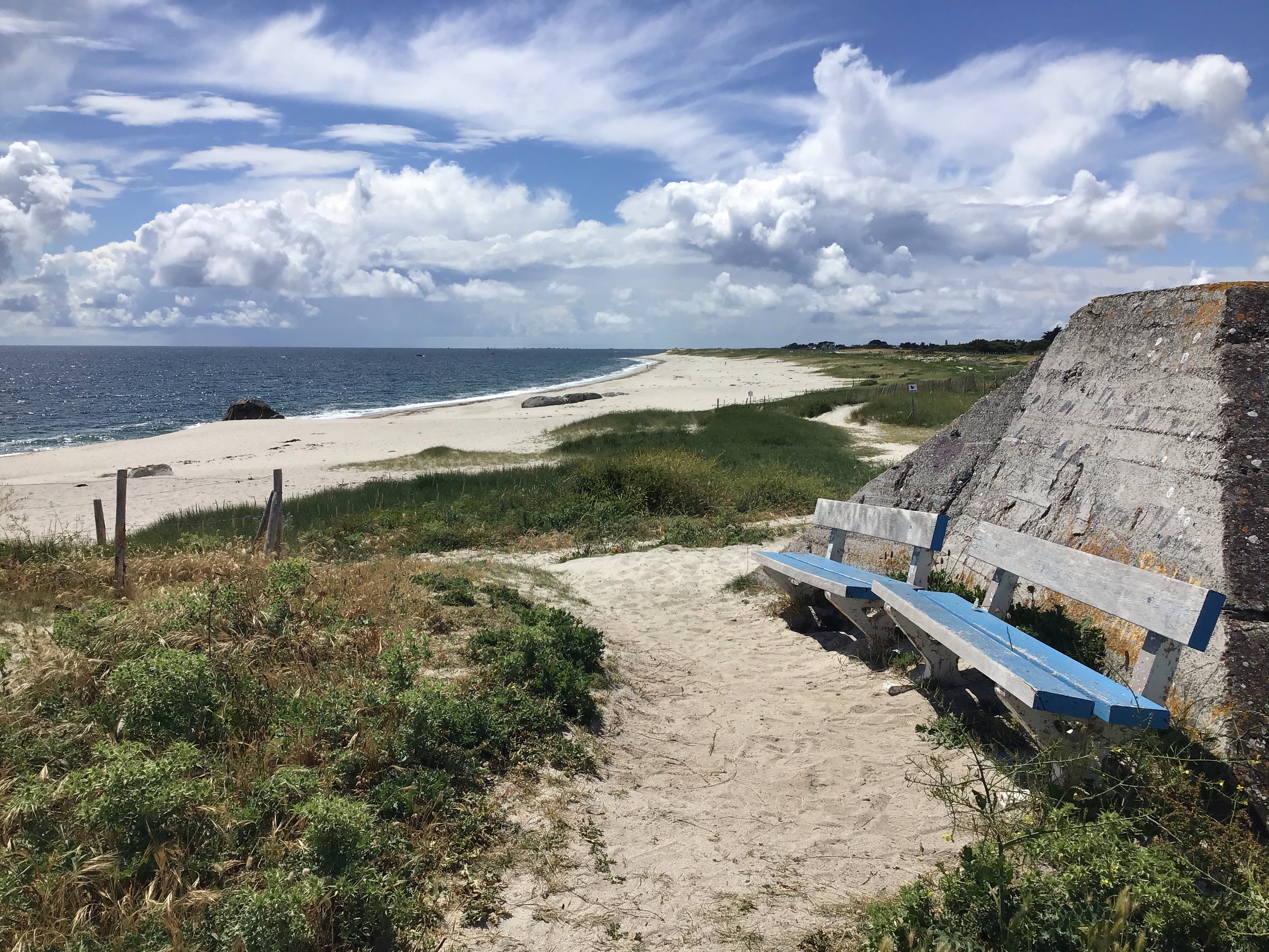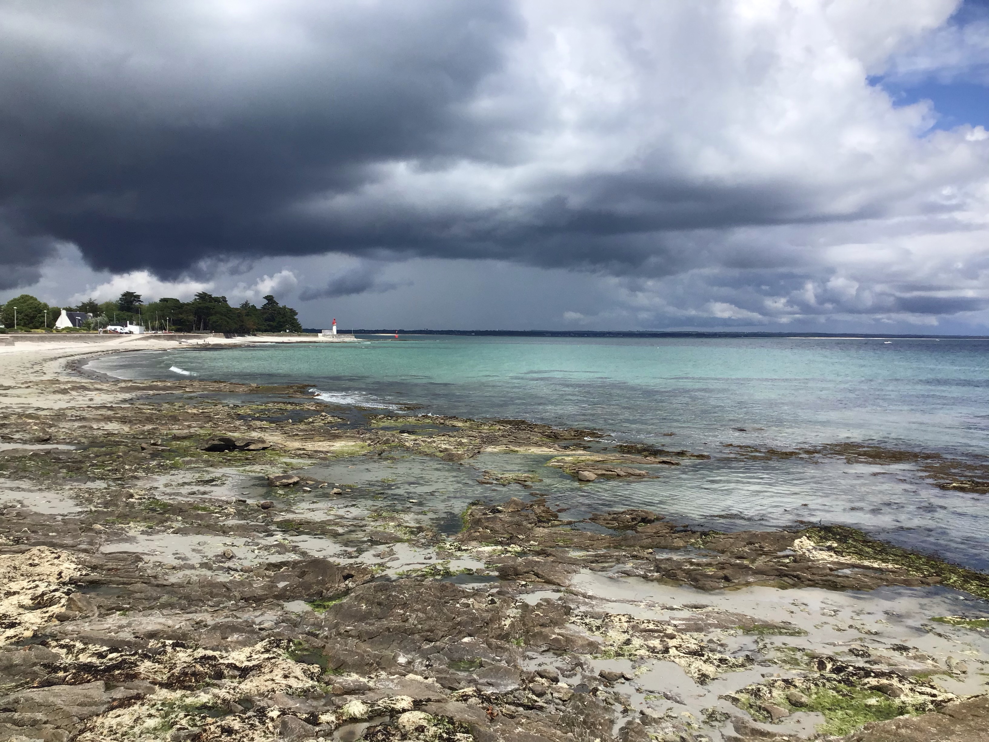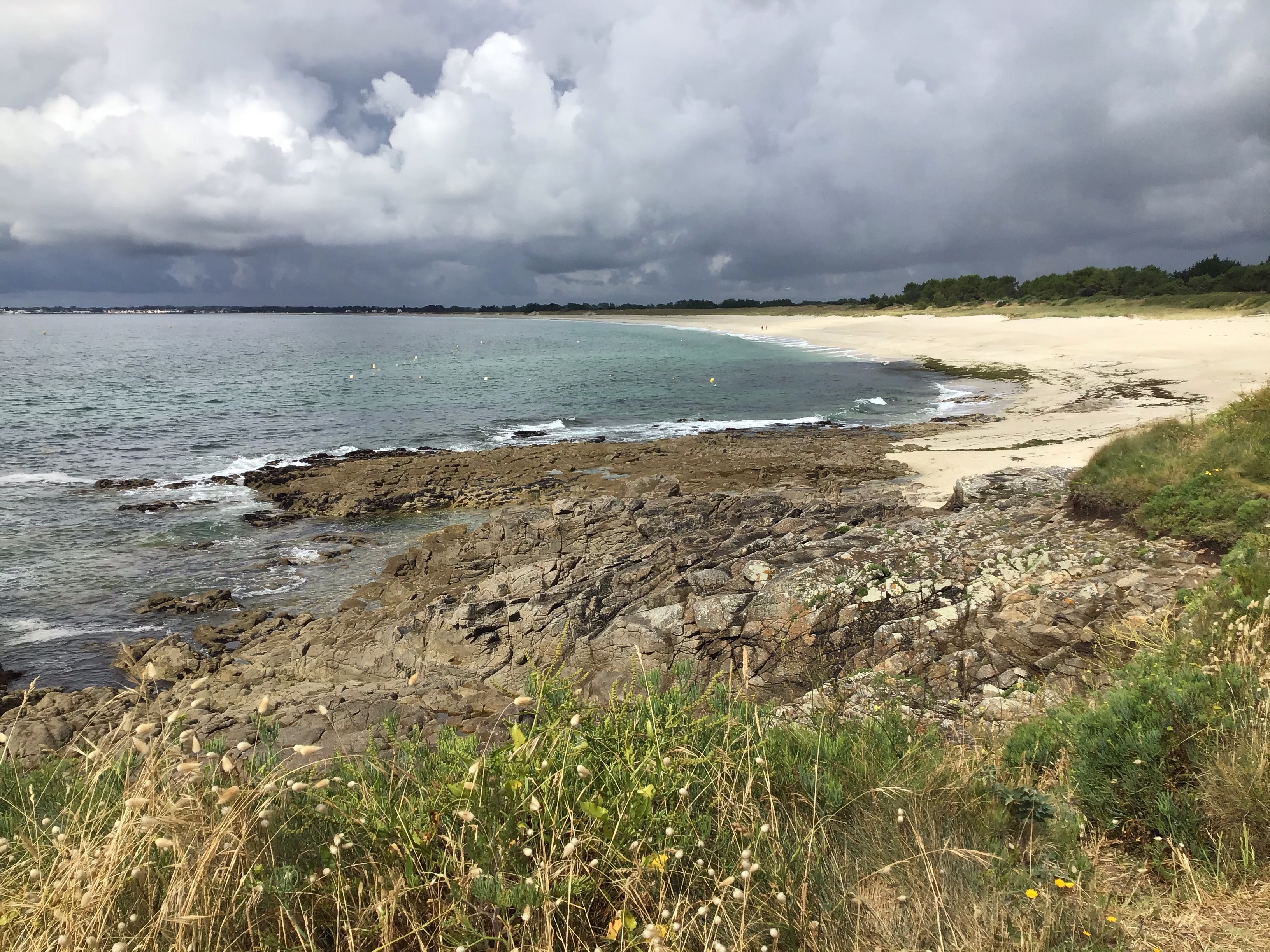 Je redescends à nouveau sur la côte jusqu’au fort de Ste-Marine et retrouve le soleil. Puis emprunte le chemin des Douaniers en longeant la splendide plage qui va jusqu’à l’Ile-Tudy. Le ciel est à nouveau menaçant. Pourvu que ça tienne.