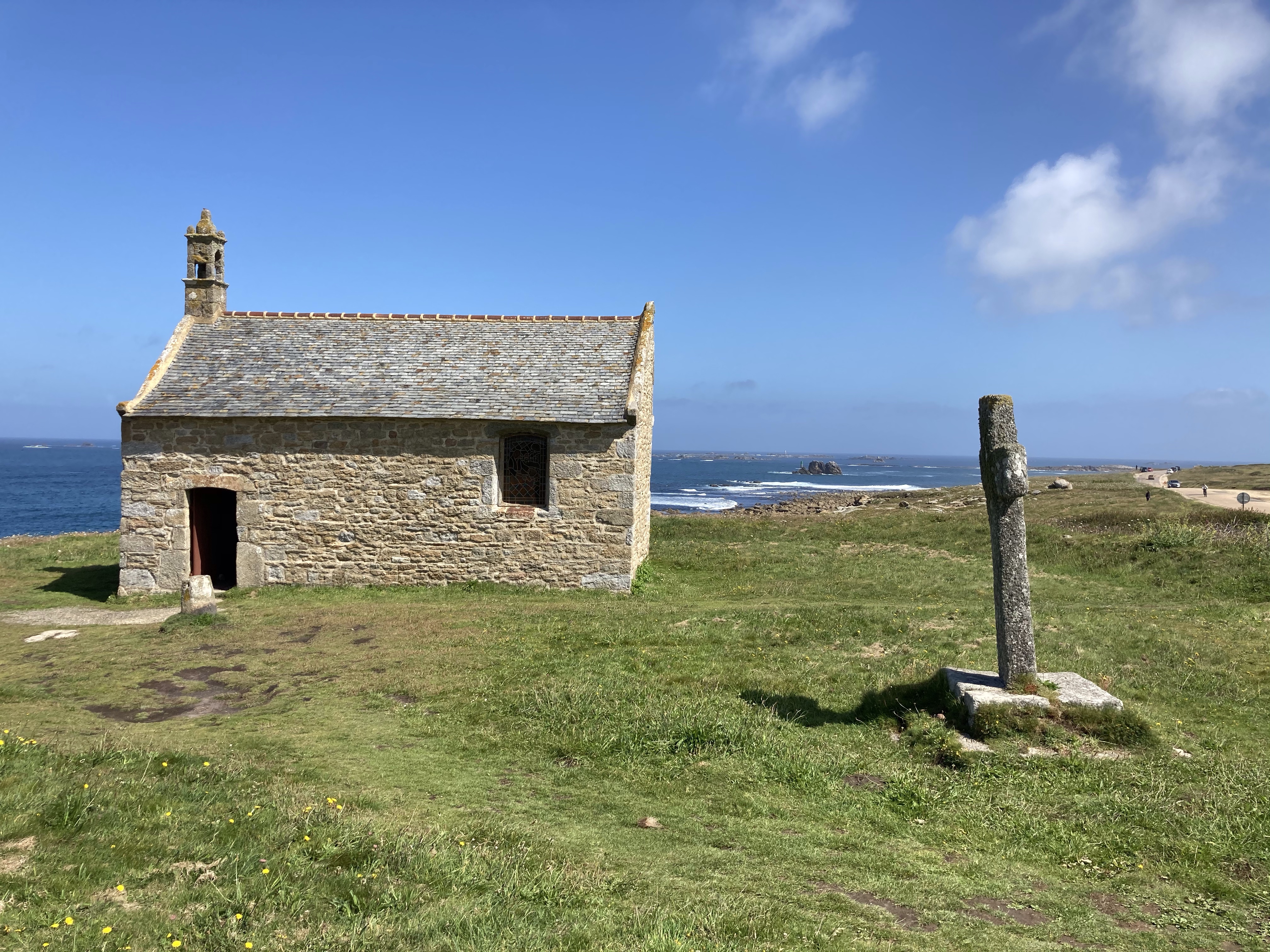 Je fais un léger siestou sous le cagnard et repars. Je continue sur la route côtière et en prends plein les mirettes avec ses cailloux éparpillés, pas évident de naviguer par ici, ses chapelles, ses croix celtiques …