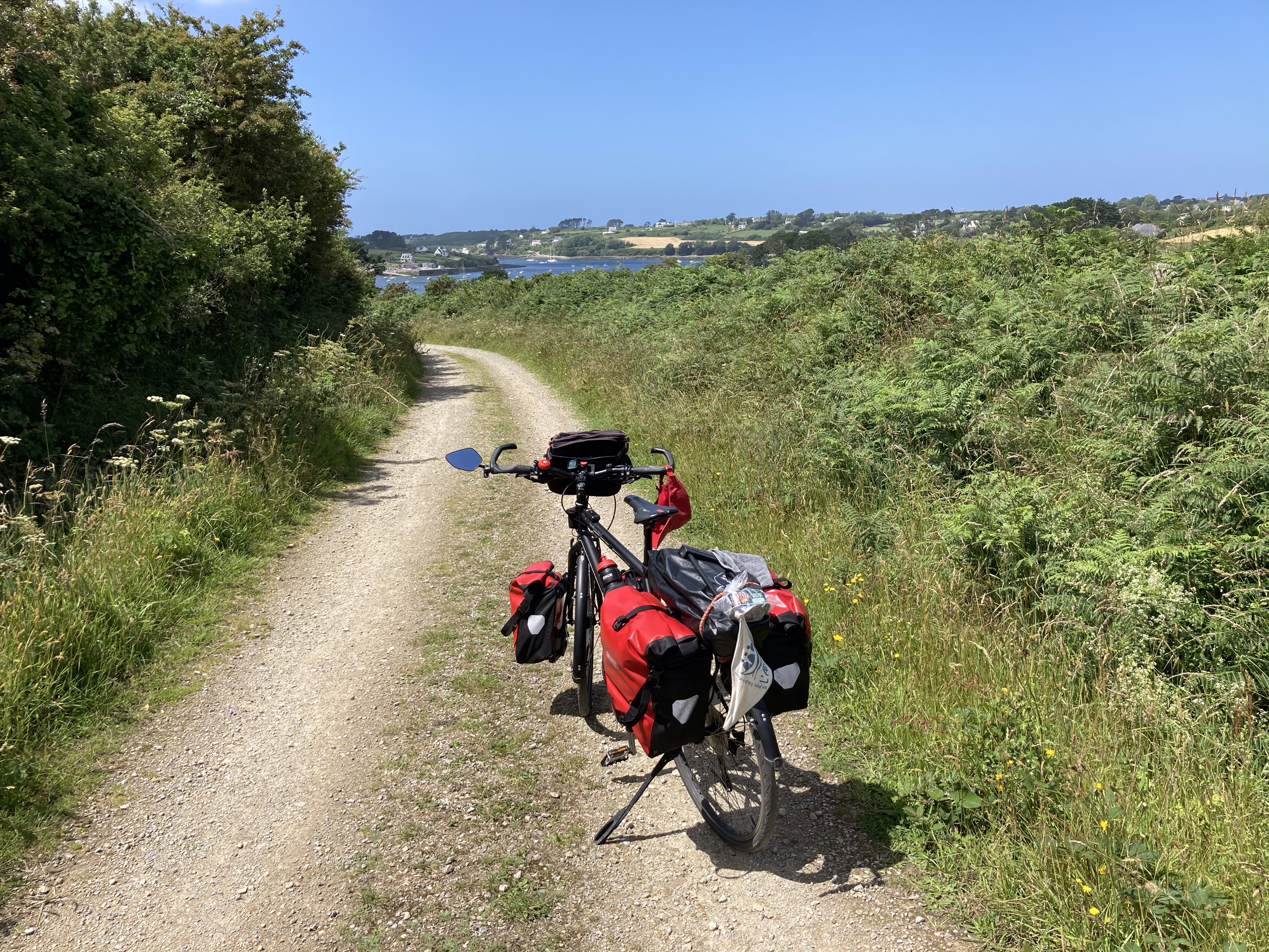 Je fais le tour de l’Aber et retrouve le front de mer. Je croise un cyclotouriste chargée de grosses sacoches jaunes Ortlieb. Un petit salut au passage et je file par la baie des Anges très fréquentée en admirant au loin la pointe de Pen Enez.
