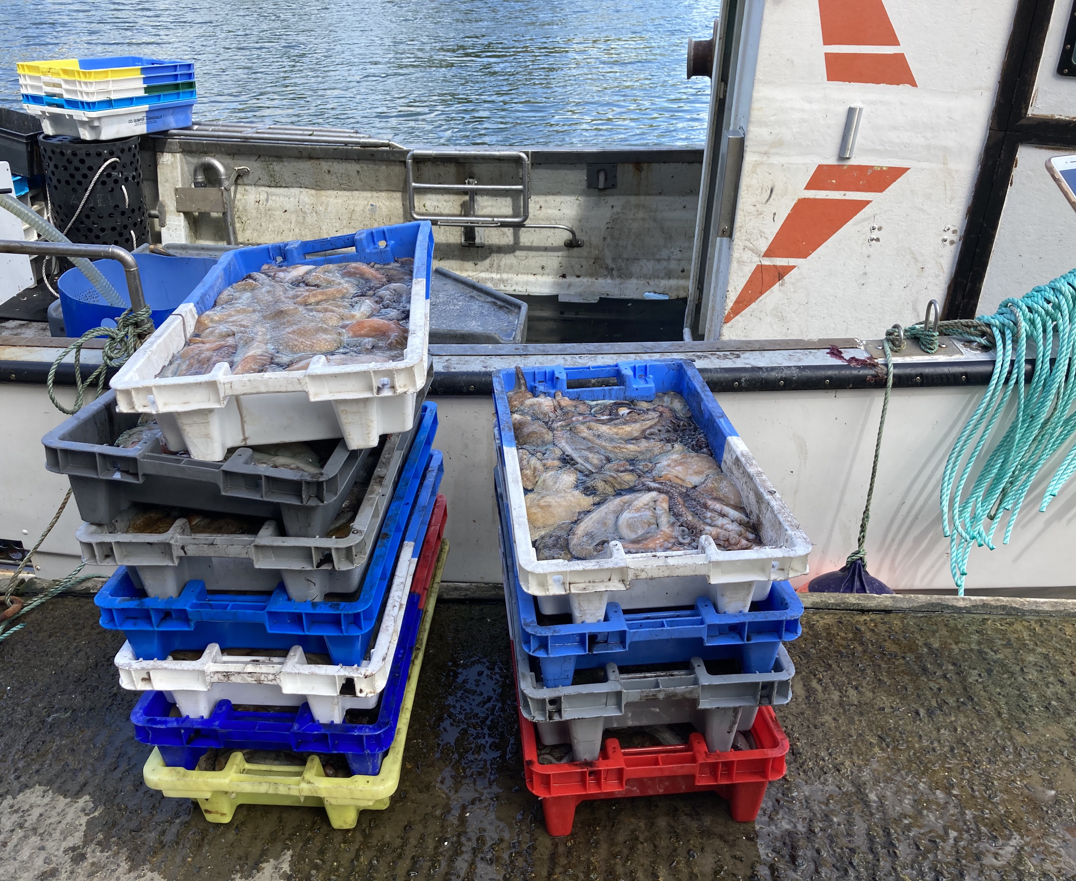 Vers 17h, je m’arrête dans un petit port pour me retaper la cerise en ingurgitant mes crêpes restantes. Je discute un moment avec deux couples de retraités qui habite à-côté de l’aéroport de Brest. On discute aéronautique avant d’aller voir un marin-pêcheur débarqué des caisses de poulpe.