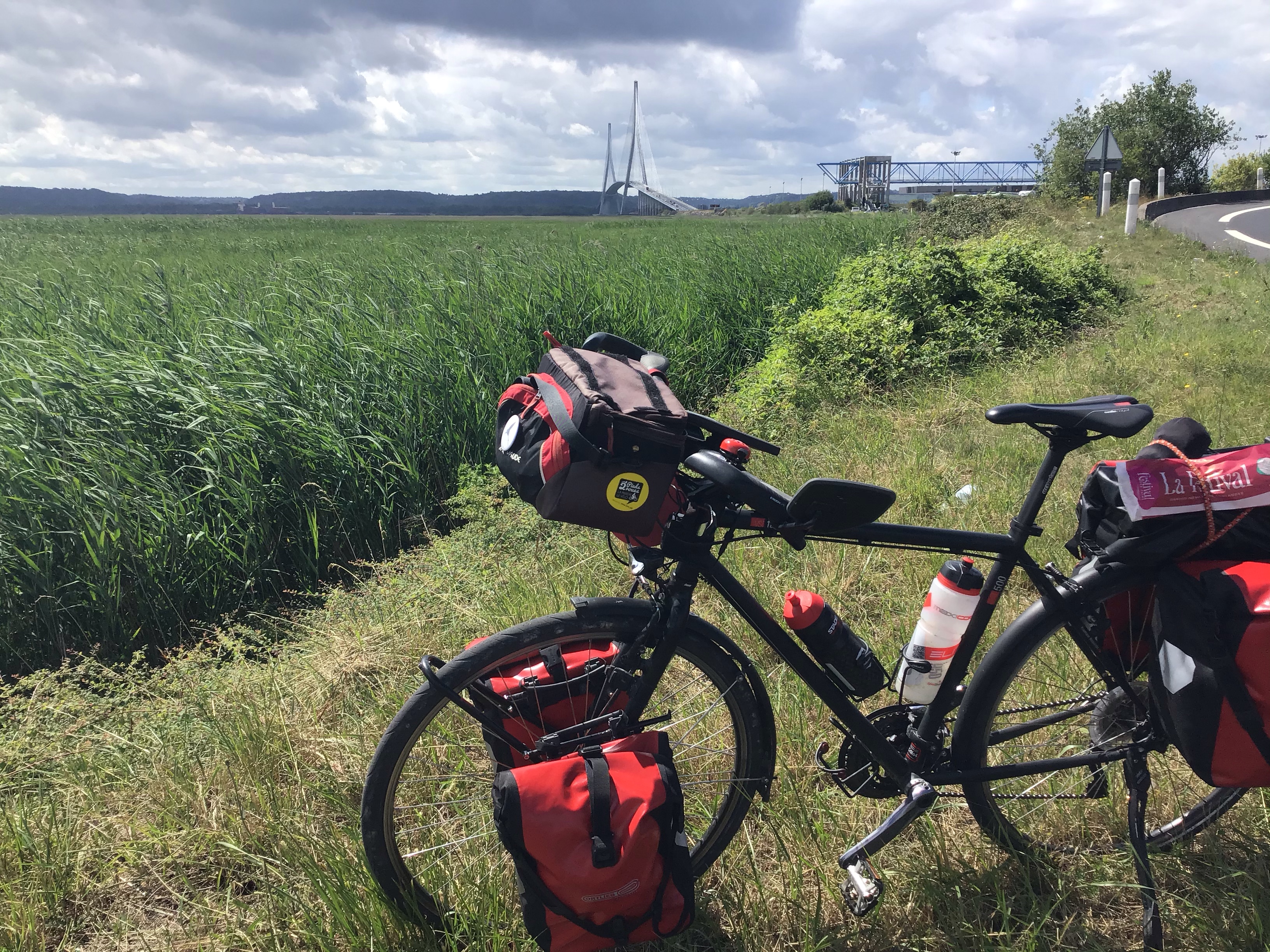 Le plus chiant reste à faire. Je vais devoir remonter la Seine puis traverser le pont de Normandie. Et là, comme à chaque franchissement de ponts, je vais serrer les fesses d’autant plus que le pont est en travaux et qu’il n’y a qu’une seule voie de circulation dans chaque sens. Et quand un convoi exceptionnel vous frôle les miches sur votre petite piste cyclable non protégée entre la montée, l’appel d’air, le poids du vélo et des sacoches qui vibrent, c’est chaud patate !