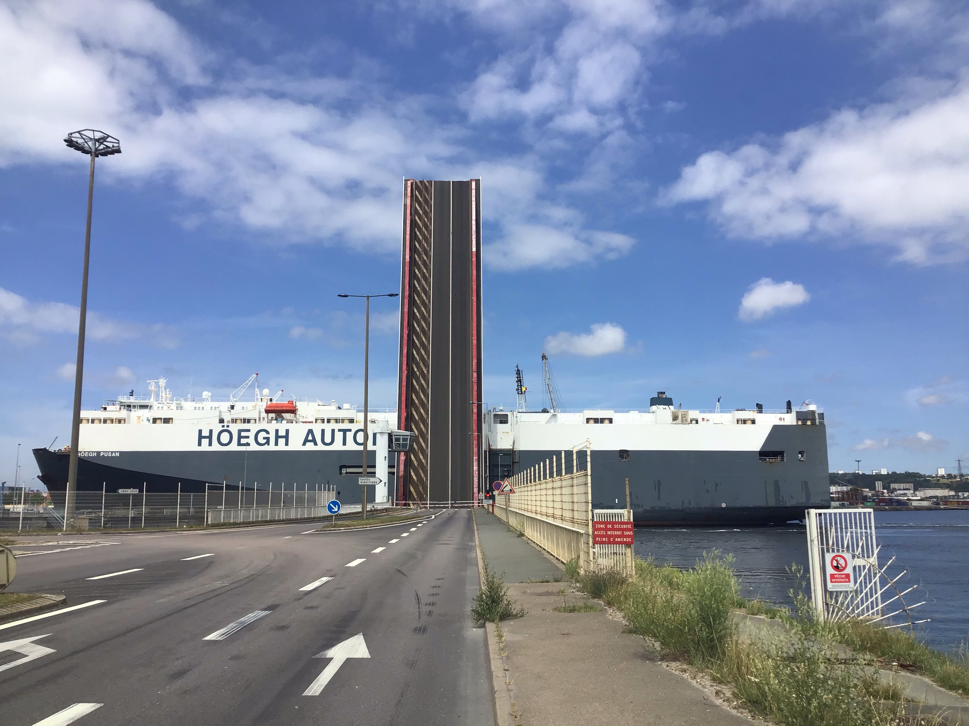 Mais il me faut maintenant rejoindre Le Havre par la zone portuaire. Et là, ce n’est pas triste non plus. Un bout de piste cyclable et puis plus rien, juste une 2 voies où transitent les poids-lourds qui roulent à vive allure. Mais, au moins eux, ils s’écartent franchement pour doubler ou n’hésitent pas à attendre si un autre poids-lourd arrive en face. Pas comme certains abrutis en bagnole. Cette zone portuaire est immense. Je finis par m’arrêter déjeuner un peu à l’écart avant d’arriver en ville. Je prépare aussi un bagage léger au cas où. Je traverse le port et assiste à une scène surréaliste : un méga-container rentrant dans une écluse avec la route qui s’ouvre pour le laisser passer.