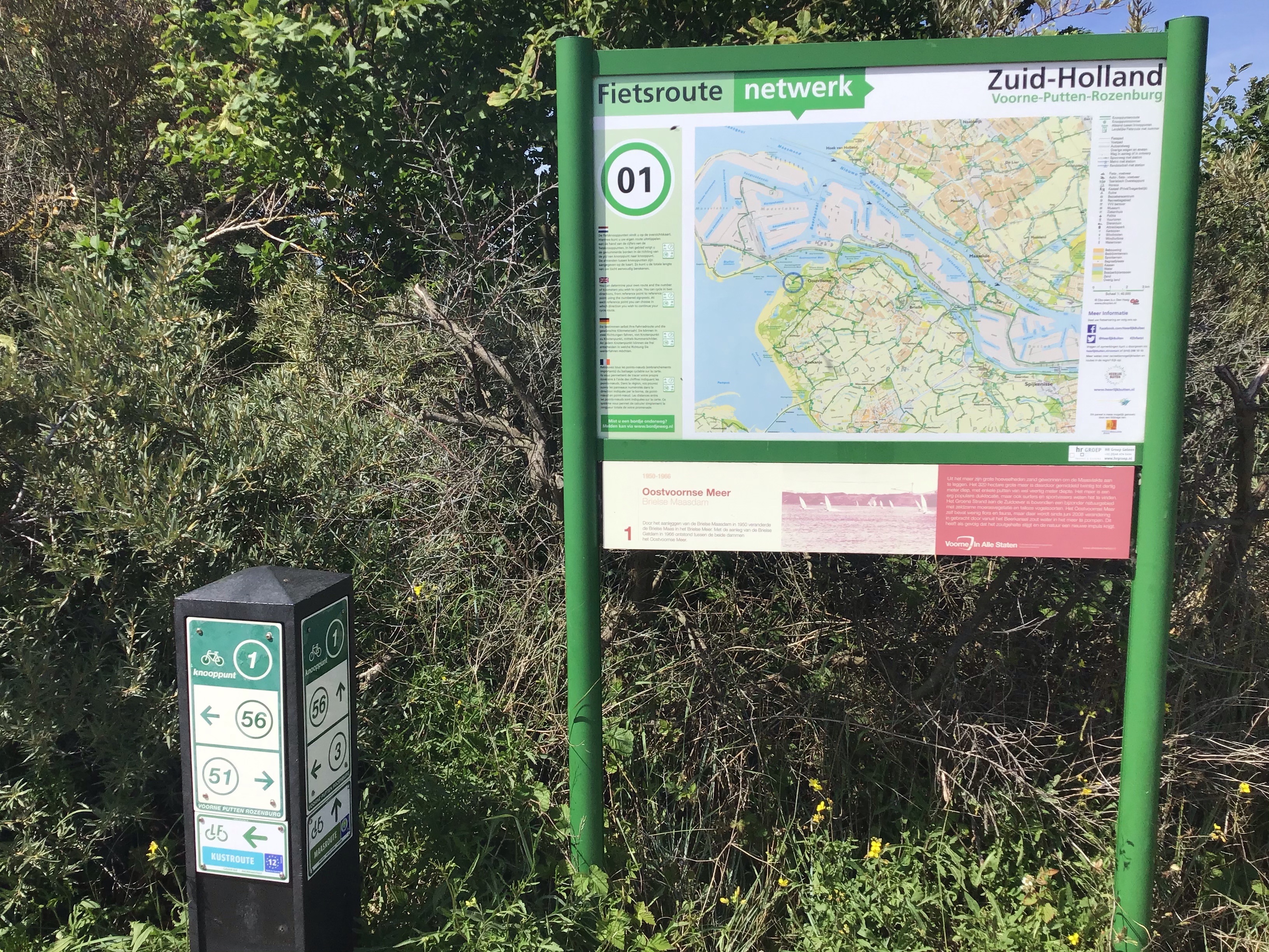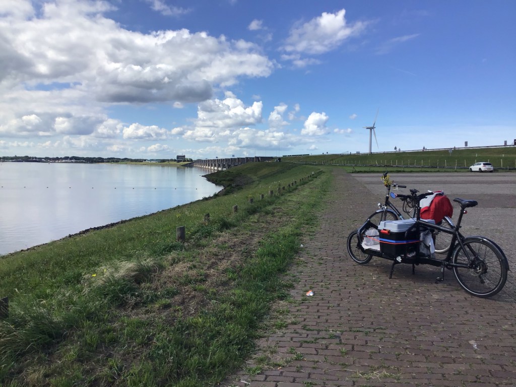 Comme je ne traverse aucun village pour trouver un café, je m’arrête finalement dans un superbe camping non loin de l’EV12. Puis je reprends ma route et, peu de temps après, me fais justement doubler par un important peloton de cyclistes aux couleurs bleues. Je m’accroche pour essayer de prendre la roue vu que j’ai vent dans le nez. Un des cyclistes me double et m’interpelle dans un très bon français. C’est un ancien capitaine de bateau, qui après avoir pas mal bourlingué, est parti avec femme et enfants vivre à St-Jean-de-Luz pendant 6 ans où il a bossé au centre Hélianthal. Nous discutons de concert et il m’indique que nous allons traversé le 1er barrage construit dans les années 1950 pour créer un polder sur cette région inondée auparavant. Manque de bol pour accéder au-dit barrage, il y a une grimpette et, avec mes sacoches, impossible de suivre le rythme du peloton. Je lui fais signe de continuer et de rejoindre son groupe. Je me retrouve à nouveau seul mais cela était sympa de pouvoir converser quelques instants en français.