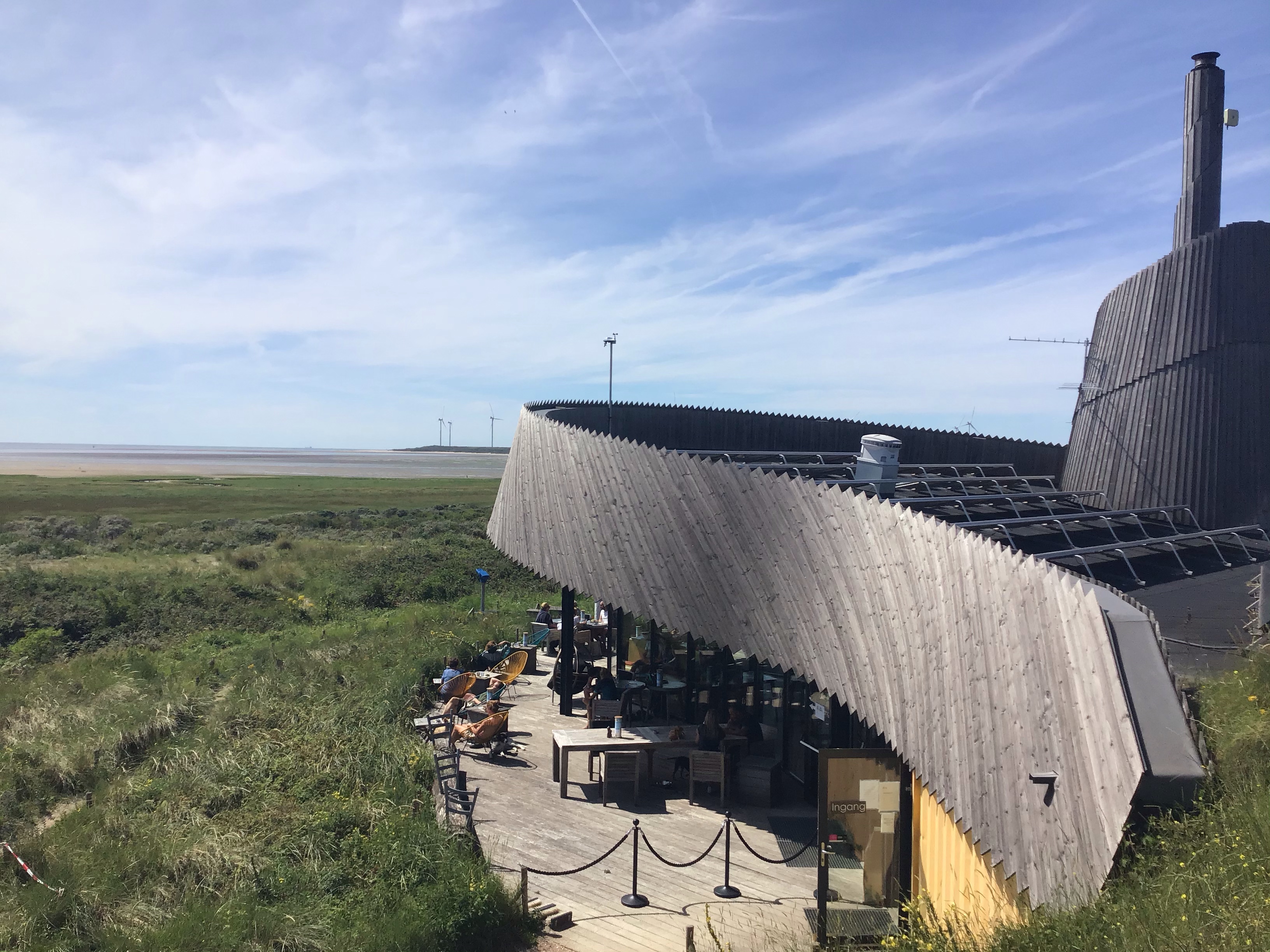 Je zigouiguite dans la campagne néerlandaise en suivant l’itinéraire EV12 qui n’emprunte que des pistes cyclables. C’est plat, calme, propre. Pas un bruit de voiture. Que des tintements de sonnettes de temps en temps pour avertir de l’arrivée d’un cycliste. Et, comme hier, ils sont fort nombreux à se balader en couple, en famille, en peloton de lycra. C’est vraiment impressionnant. Je m’arrête à nouveau en bordure de plage à Oostvoorne dans un café-restaurant classe pour y prendre un café-gâteau au bar vu que toutes les tables sont occupées. L’addition (7,75€) est plutôt corsée mais vu l’emplacement et le cadre. Ce sera mon petit plaisir dominical.