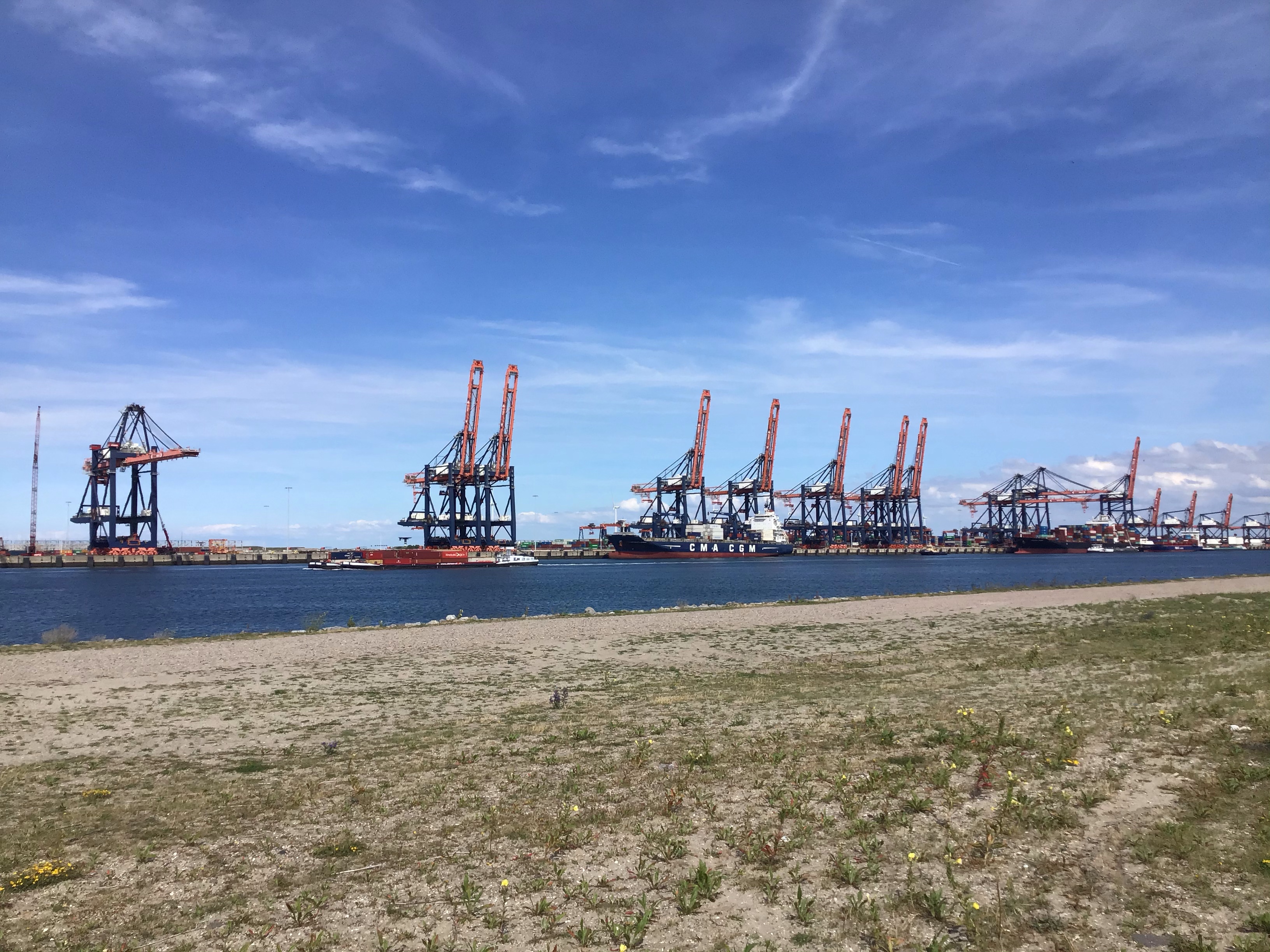 Après quelques kilomètres, c’est changement radical de décor. J’arrive dans le port de Rotterdam, un des plus grands ports européens (si ce n’est le plus grand). Je roule un moment dans cet impressionnant capharnaüm en suivant attentivement les panneaux EV12 avant d’arriver devant un cul-de-sac, en fait un embarcadère, qui m’oblige à prendre un ferry. J’allais dire que j’étais content d’être dimanche et de ne pas avoir à subir la circulation, que j’imagine incessante, de poids-lourds et de voitures. Mais là, il me faut patienter …