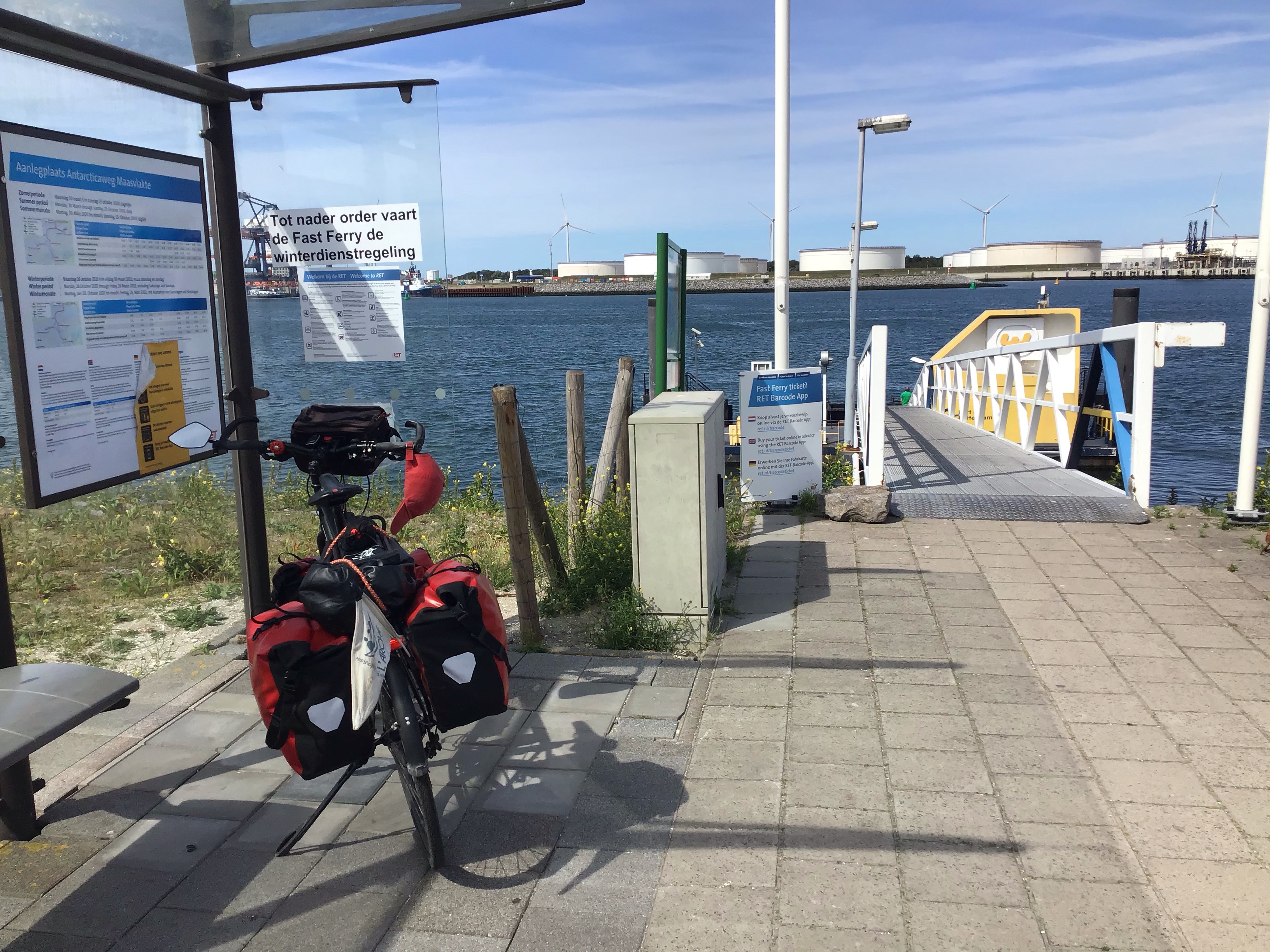 Il est 16h30 à l’arrêt « Aanlegplaats Antarcticaweg Maasvlakte ». Le prochain ferry à destination de Berghaven à 3kms au nord est annoncé à 17h01 en période estivale. Une bande de jeunes à scooter arrivent et me disent qu’ils attendent aussi ce ferry.