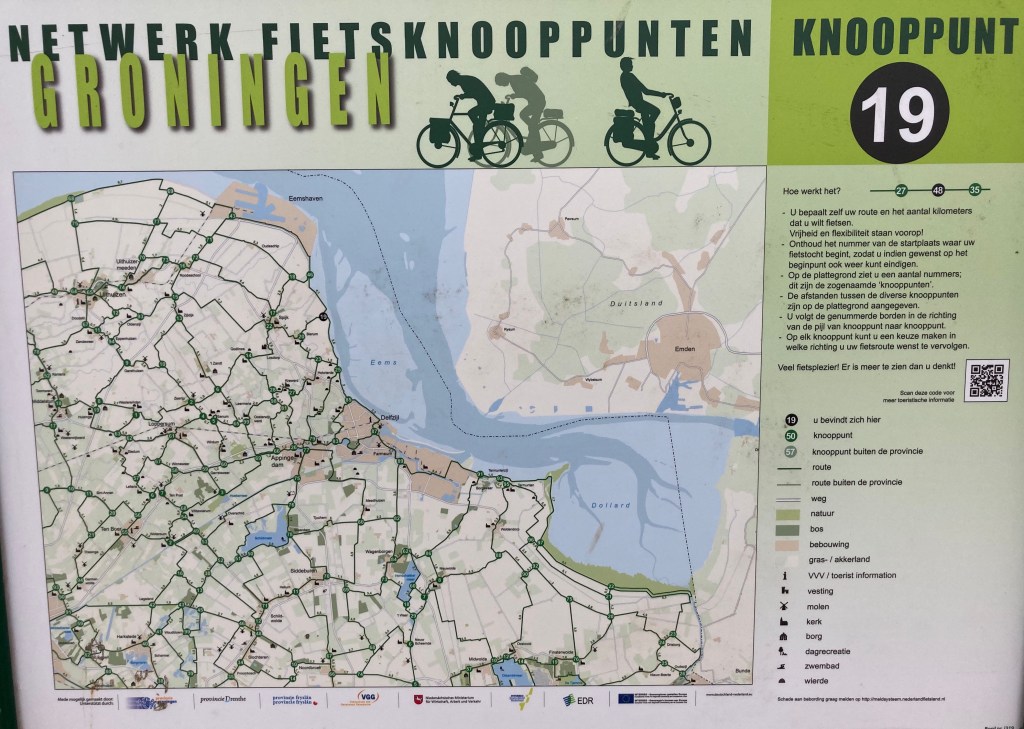 D’ailleurs, pour en remettre une couche sur le vélo, voici un exemple avec le plan de la province de Groningen et ses axes cyclables. A chaque noeud, vous trouvez une borne et son numéro, il suffit de vous diriger vers le numéro suivant. Vous pouvez aussi flasher le QR-code puis vous laisser guider par votre appli préférée. De mon côté, j’ai plus ou moins suivi la CustRoute – EV12 et cela va continuer encore pendant quelques temps j’espère …