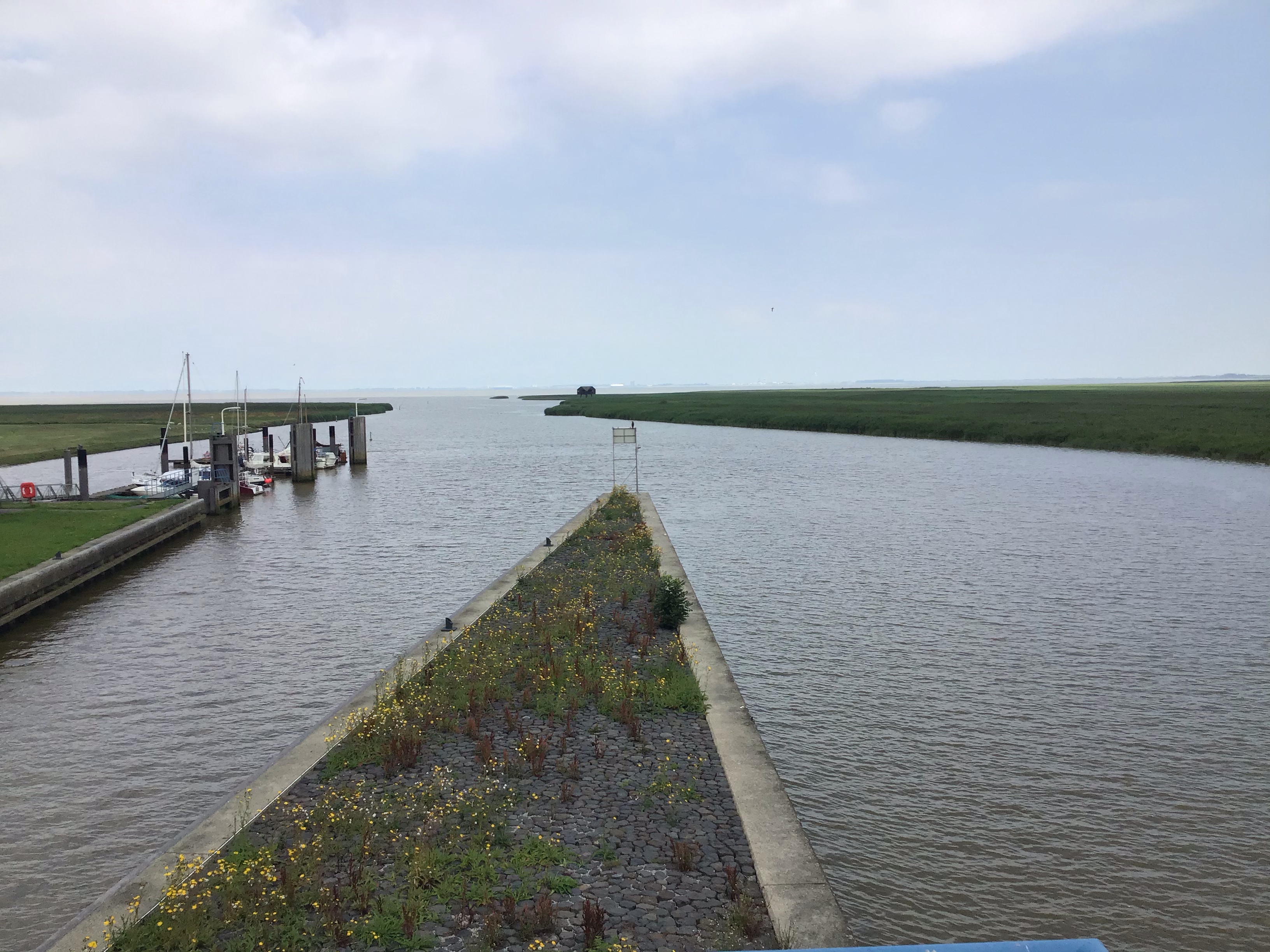 Et me tape finalement un marathon à longer la digue sans croiser grand monde. Je finis par arriver à 11h à la frontière que je traverse sans plus aucun contrôle ce qui rompt un peu le charme du voyage je trouve. Comme je n’ai pas trouvé un seul café, je me pose et me fais un café-gaufrette avant de poursuivre mon chemin.