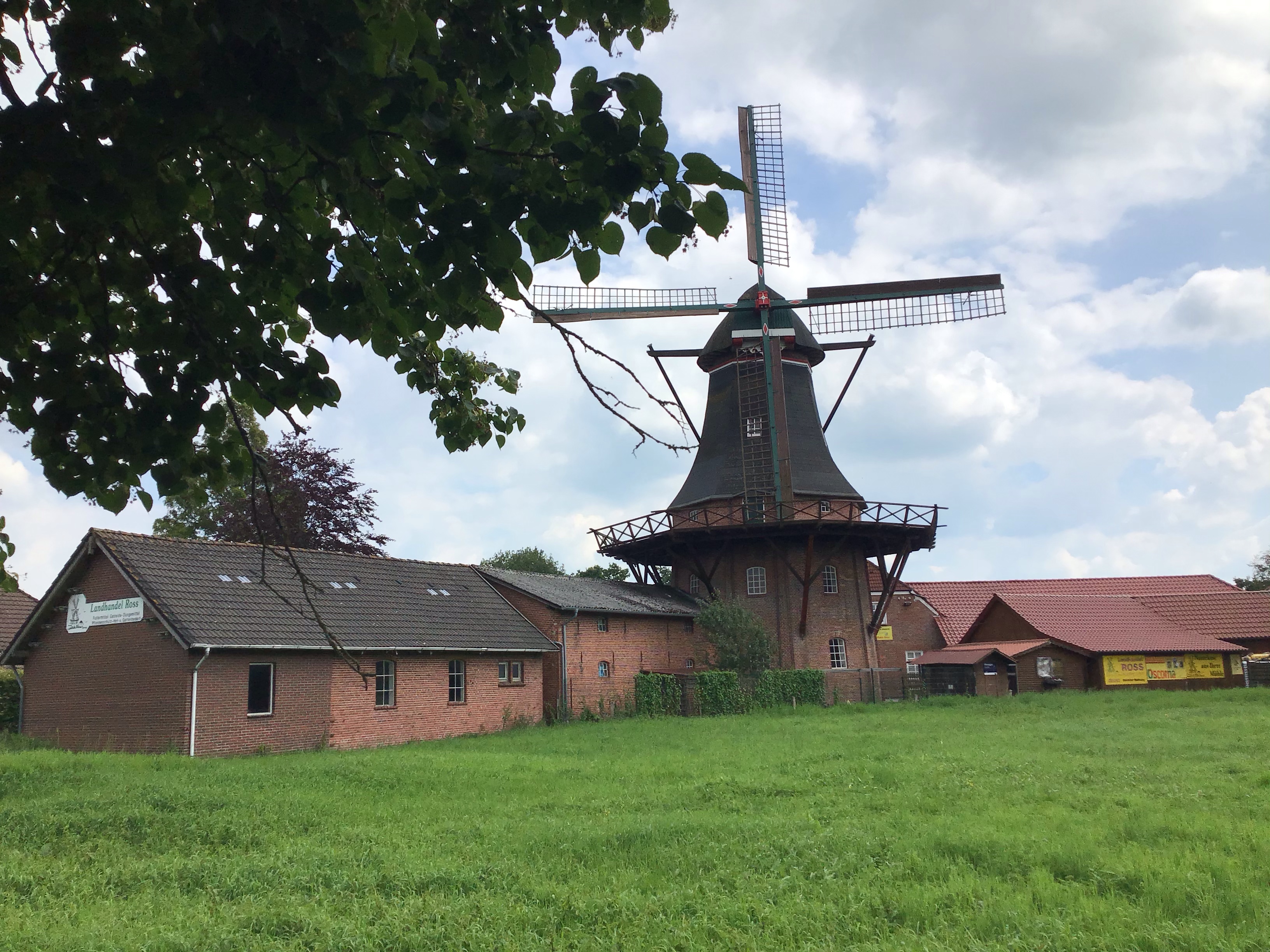 A l’arrivée à Emder, de l’autre côté de l’Ems, 2 possibilités s’offrent à moi. Soit je file à l’ouest pour suivre la mer du Nord, suivre certainement une digue comme ce matin et en quiller plus de kms, soit je file nord-est à travers champs. J’opte pour cette 2è option et me voilà à nouveau sur le réseau cyclable allemand comme en septembre dernier. Après une partie pas très sympa avec piste cyclable mais en bordure de la route principale (pensée pour Béné … elle comprendra), je récupère la piste qui longe le Ems-Jade-Kannal qui m’emmène vers WilhemsHaven. Le moulin du meunier fonctionne. Je m’arrête dans une backereï non loin de là en espérant que la farine du pain complet acheté provienne de ce moulin. Je me prends aussi un gâteau noisette-chocolat-caramel qui ne devrait pas être dégueu pour ma pause 4h.