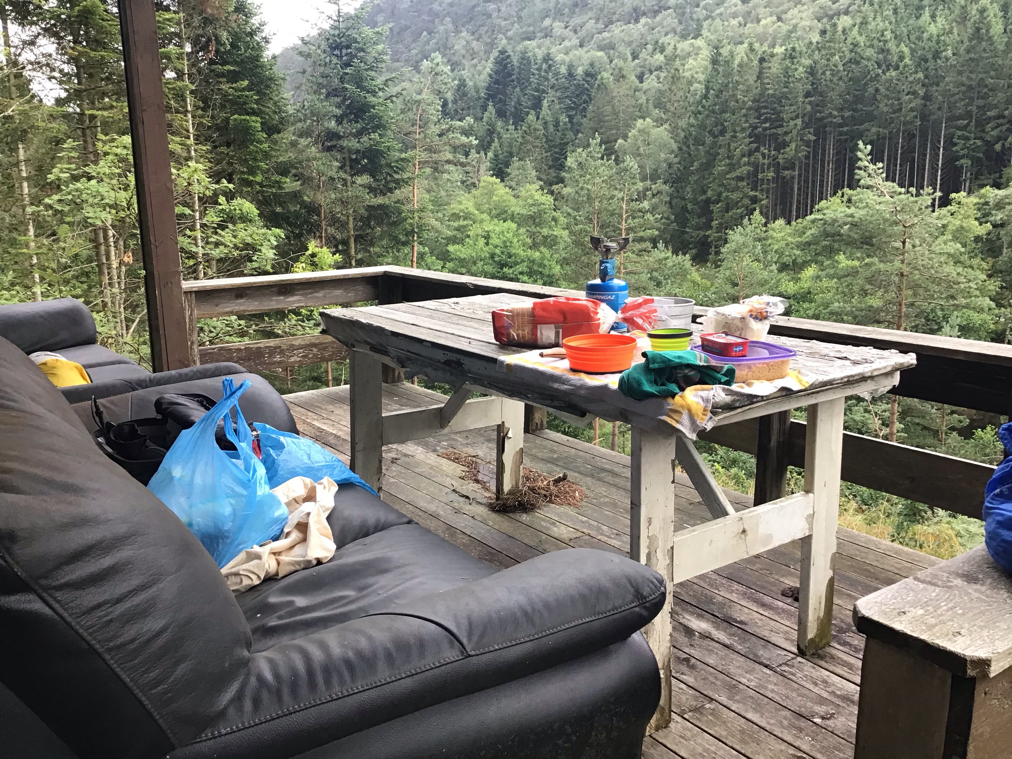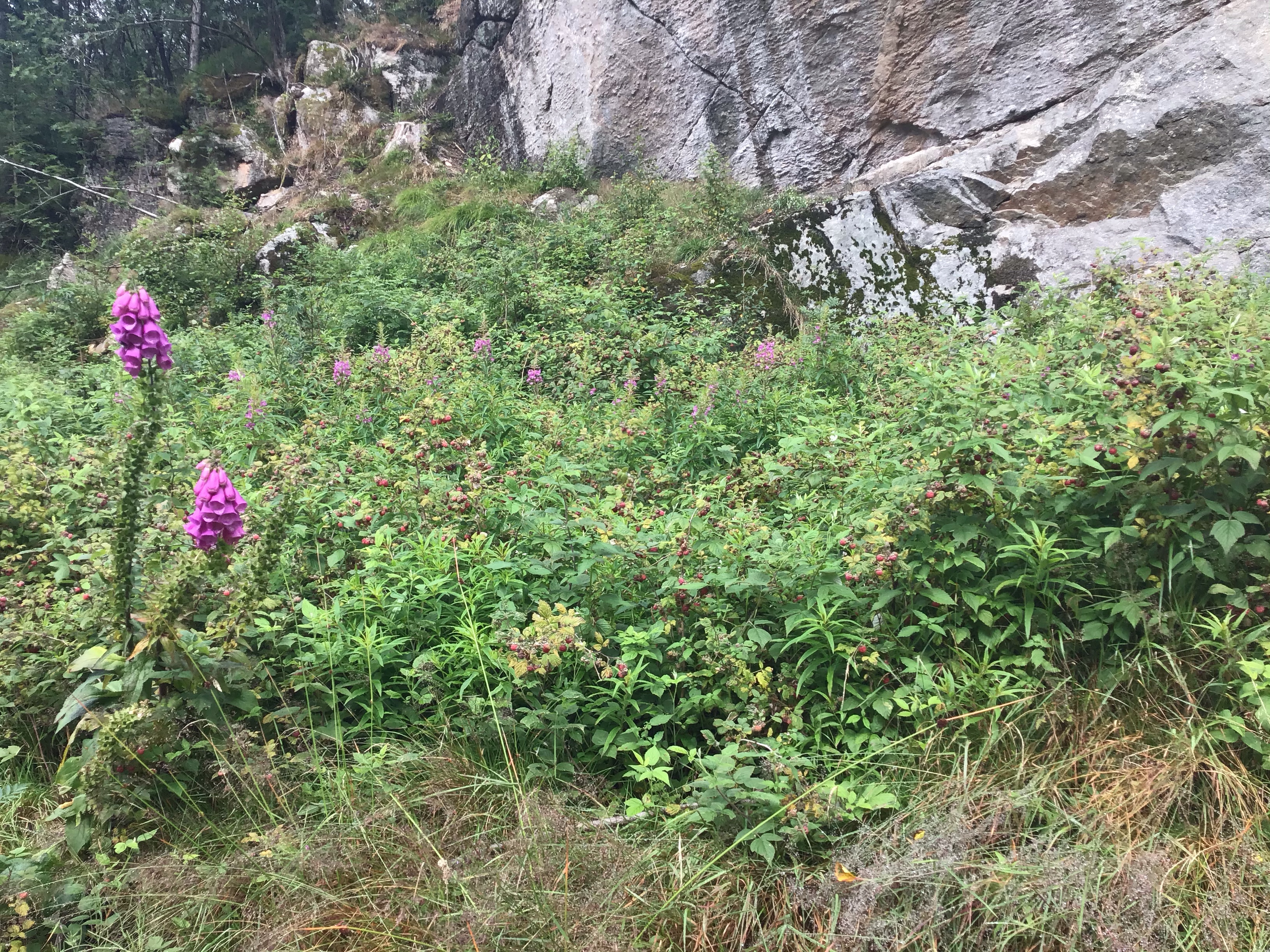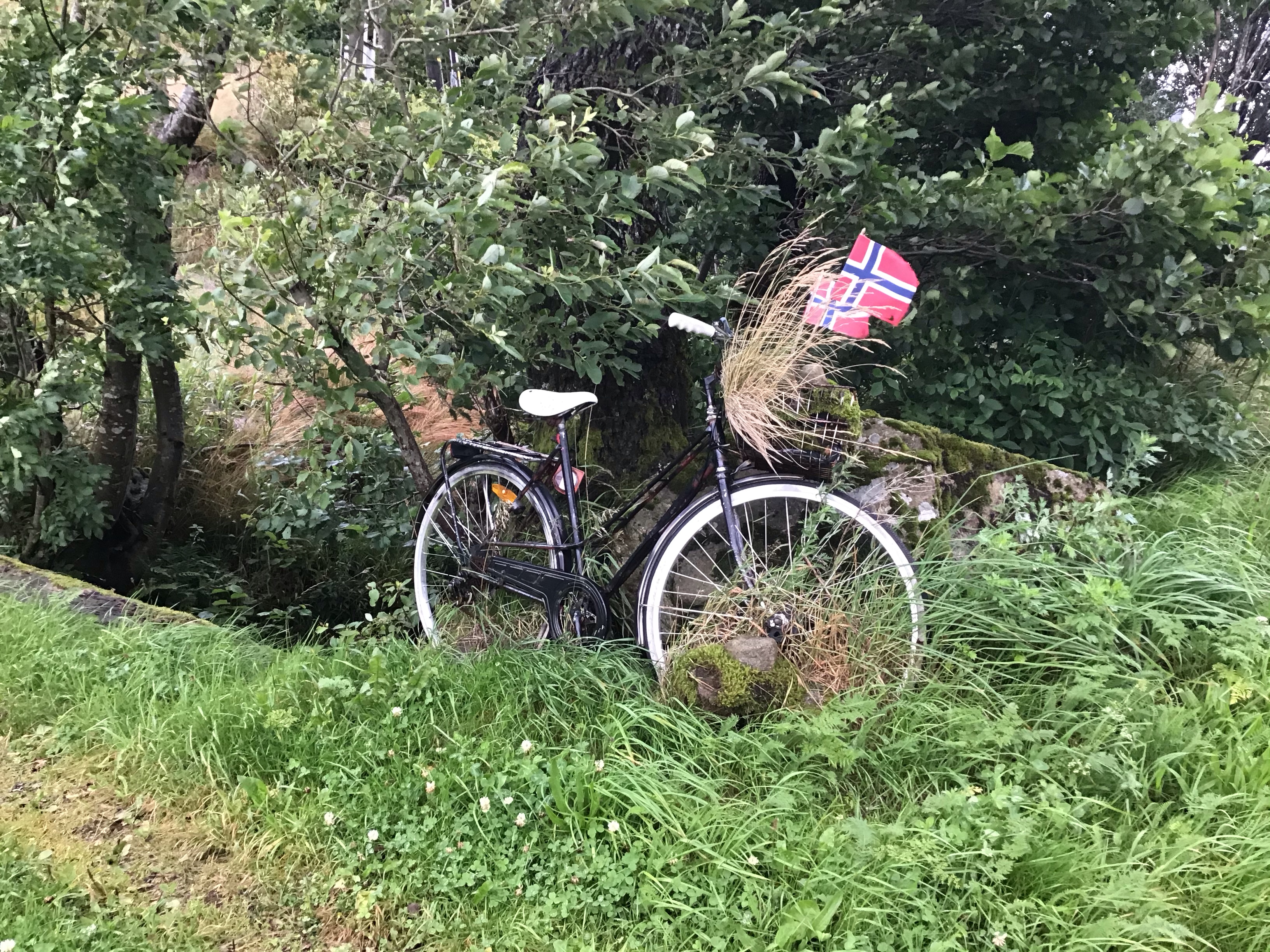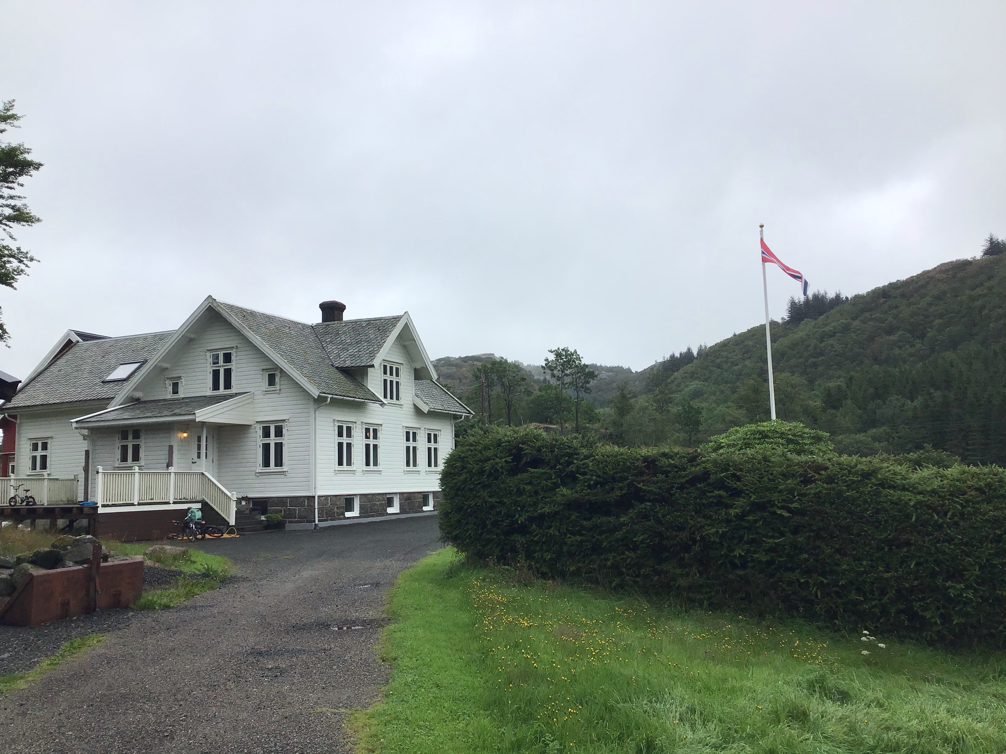 Et comme il ne pleut plus, j’envisage un bivouac sauve. Je traverse donc cette ville et suit l’itinéraire en direction d’Egersund à 60kms à l’ouest avec encore 3 belles bosses à grimper. Arrivé près du lac d’Halsavann, je repère une petite maison nichée sur un promontoire à droite de la route. Je vais voir. Elle est fermée et semble bien délaissée mais il y a une terrasse devant qui sera parfaite pour m’accueillir la soirée. Je monte le vélo avec difficulté et je peux dresser le campement. En fin de soirée, lors de ma balade digestive, je tombe sur des myrtilles qui ne passeront pas l’été. Je sors mon duvet et dodo sur ce grand canapé hyper confortable. Le ciel a l’air de s’éclaircir. Je croise les doigts avant de m’endormir et de rejoindre ma chère Morphée …