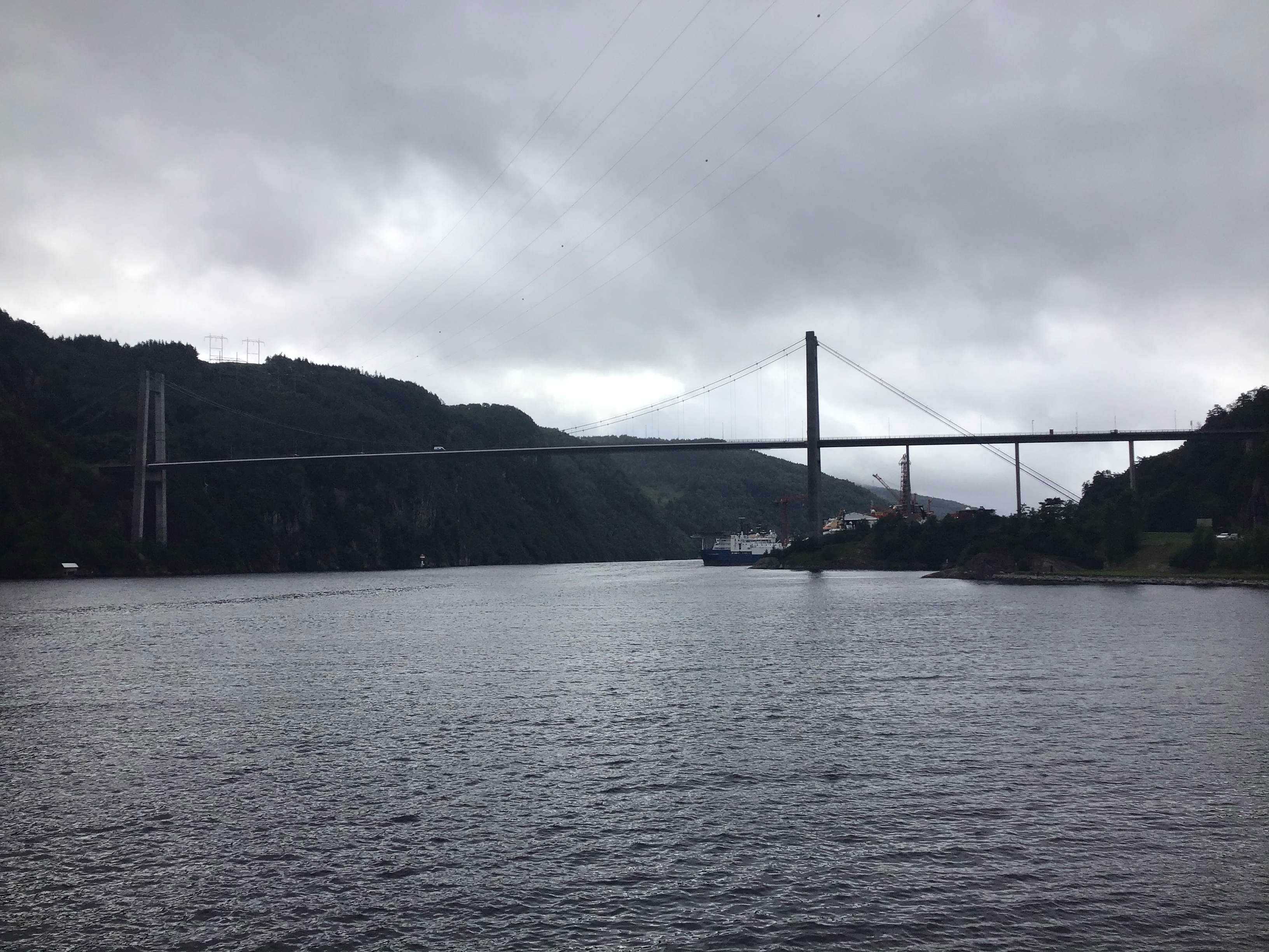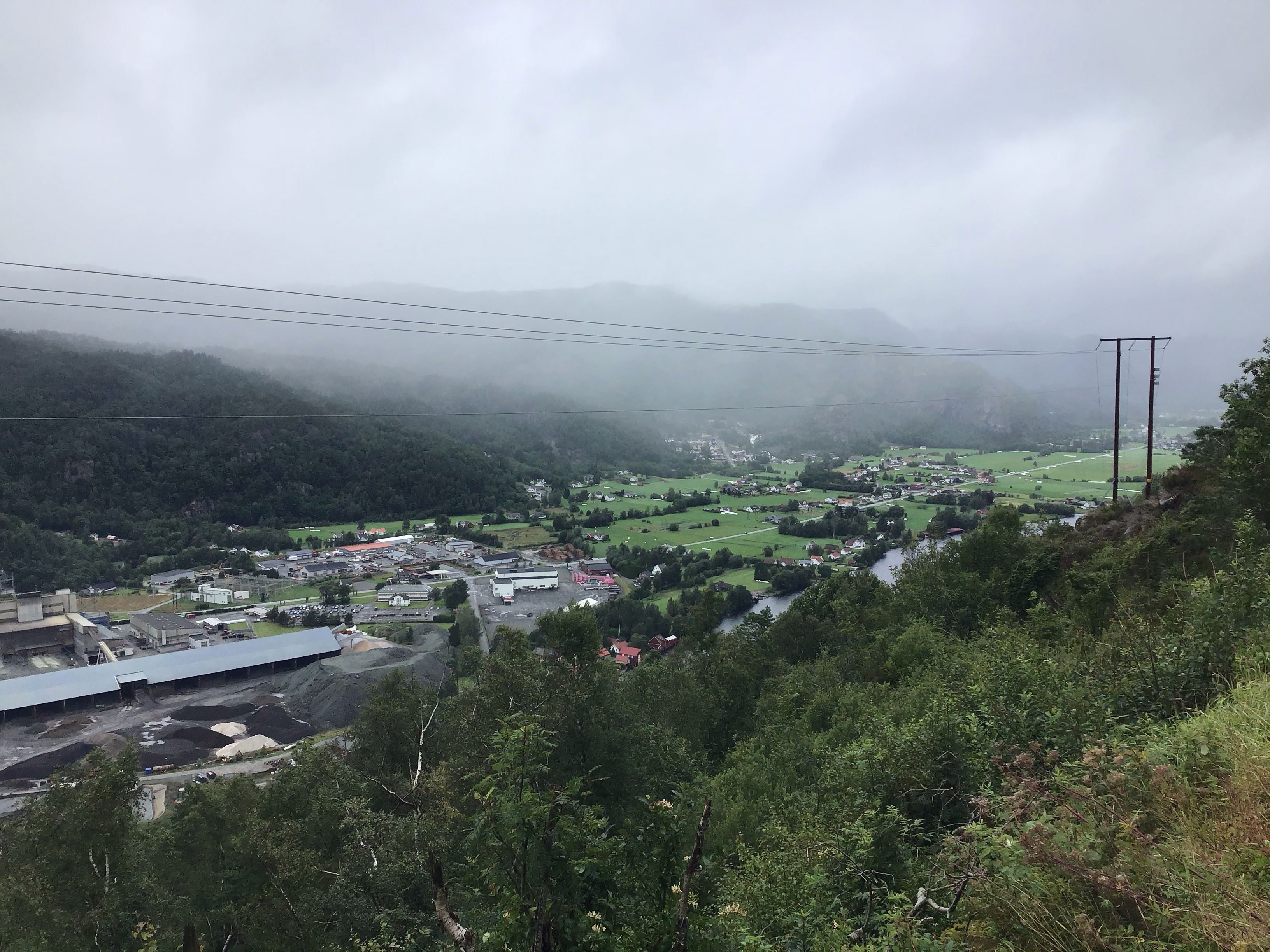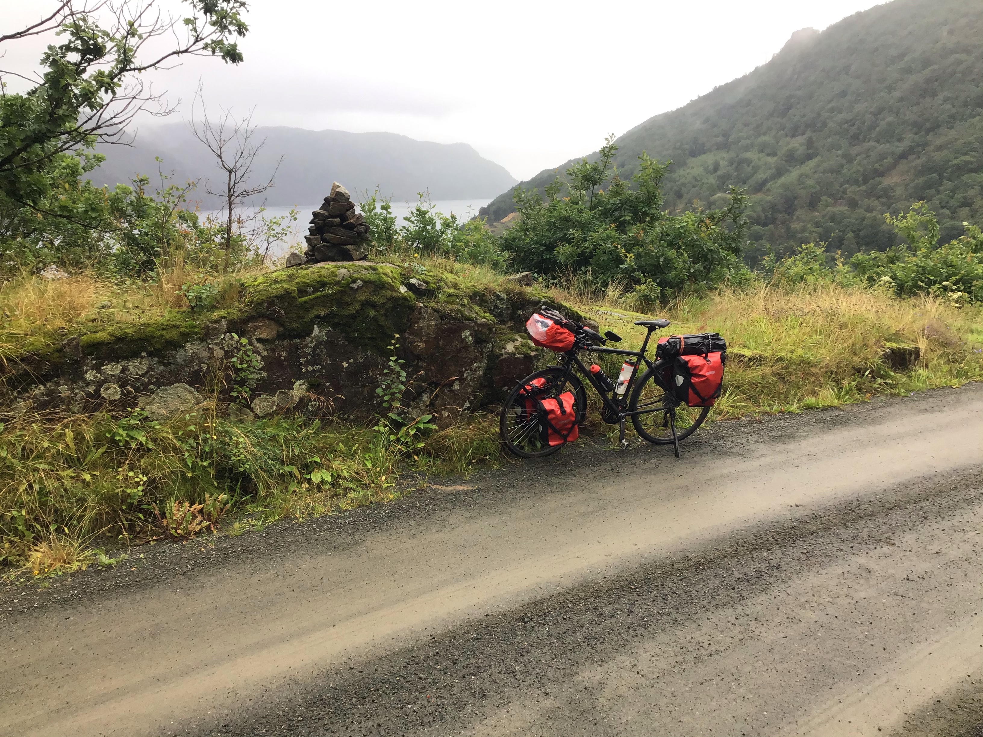Je finis par arriver au fameux croisement avec la voie rapide E89 couplée à la route 465 qui va directement à Feda. Cet axe est interdit aux vélos et aux piétons. J’inspecte les lieux et trouve effectivement que c’est hyper dangereux : pas de voie de service, un tunnel de 2kms à emprunter, de la circulation. Je préfère faire une quinzaine de bornes en plus et traverser ce fjord à Kvinesdal que de prendre des risques inutiles et de me retrouver dans un fauteuil roulant voire pire. Je pense qu’Iker a dû malheureusement emprunter cet axe. Je prends donc la « route des crêtes » qui surplombe la vallée.