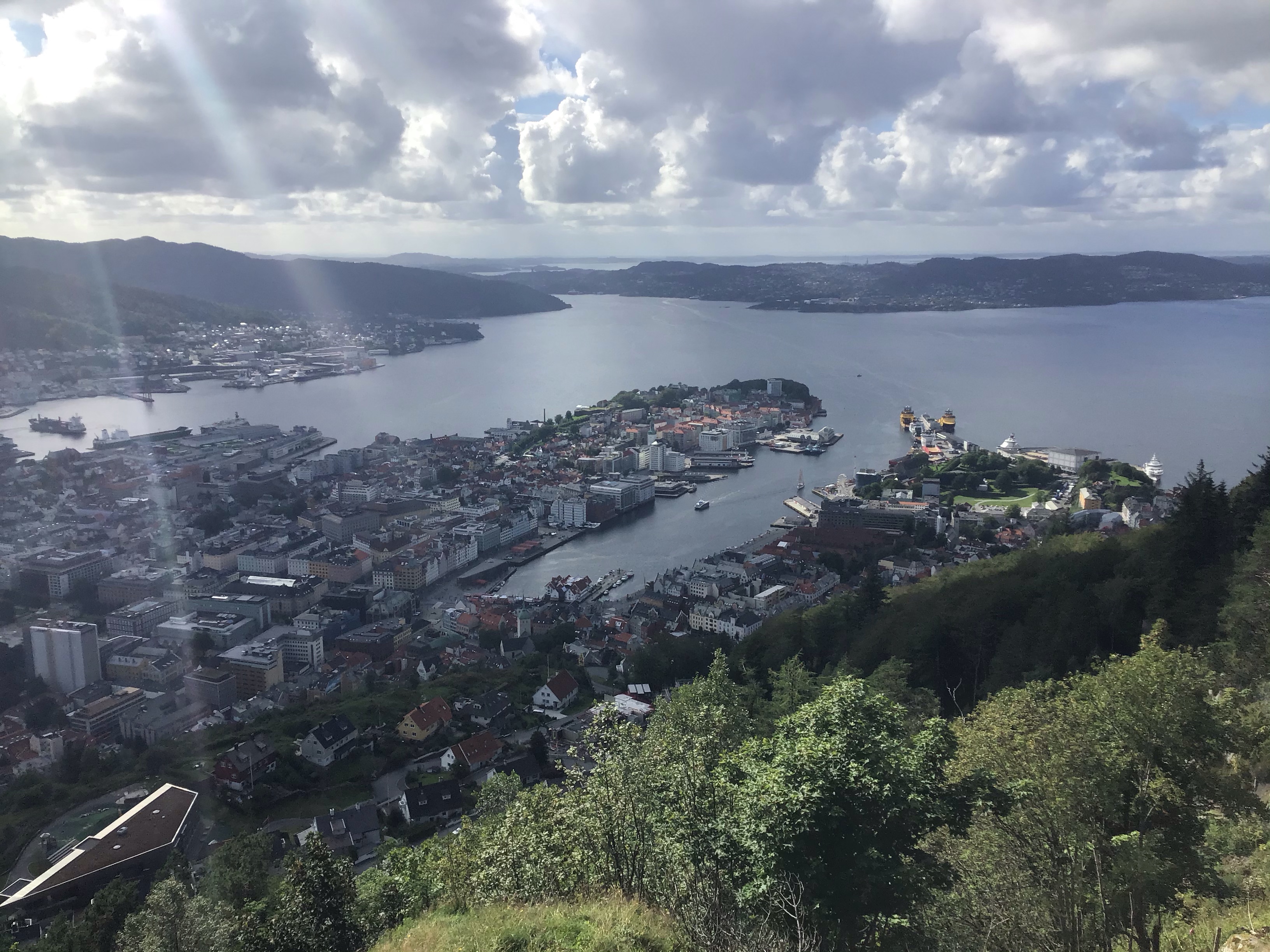 Je prends ensuite le funiculaire qui m’emmène à Floyen, montagne au-dessus de Bergen d’où la vue sur la ville et les fjords alentours est superbe.