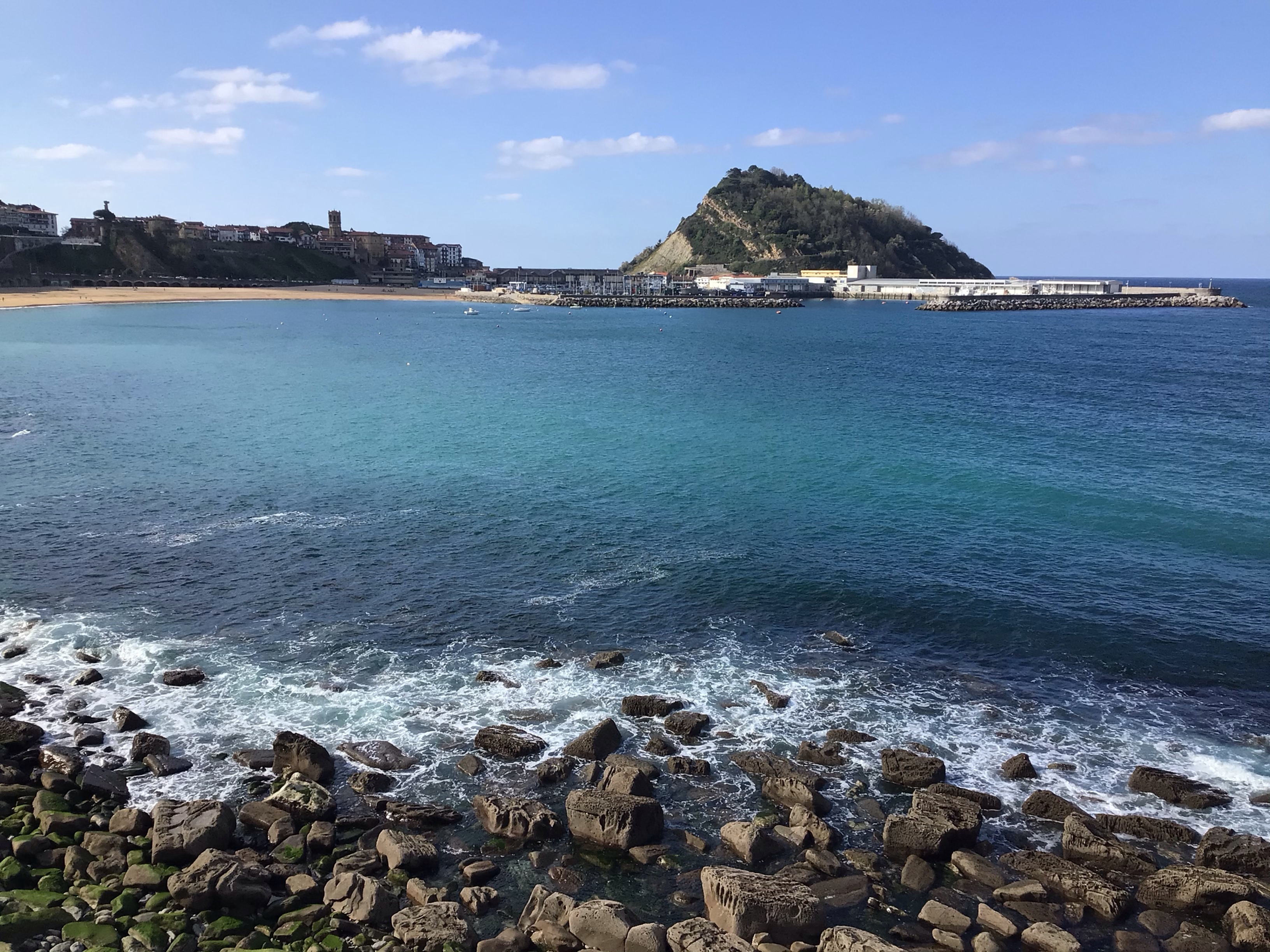 Puis grosse descente dans la vallée. Je retrouve ensuite un nouveau tape-cul qui serpente dans les vignes. J’ai souvenir de l’avoir déjà emprunté. J’ai même du mal à doubler des randonneurs. Ensuite l’itinéraire devient plus plat en longeant le front de mer mais aussi la N-634 où ça circule pas mal en ce dimanche Pascal. Je traverse Getaria et sa magnifique baie aux eaux turquoises.
