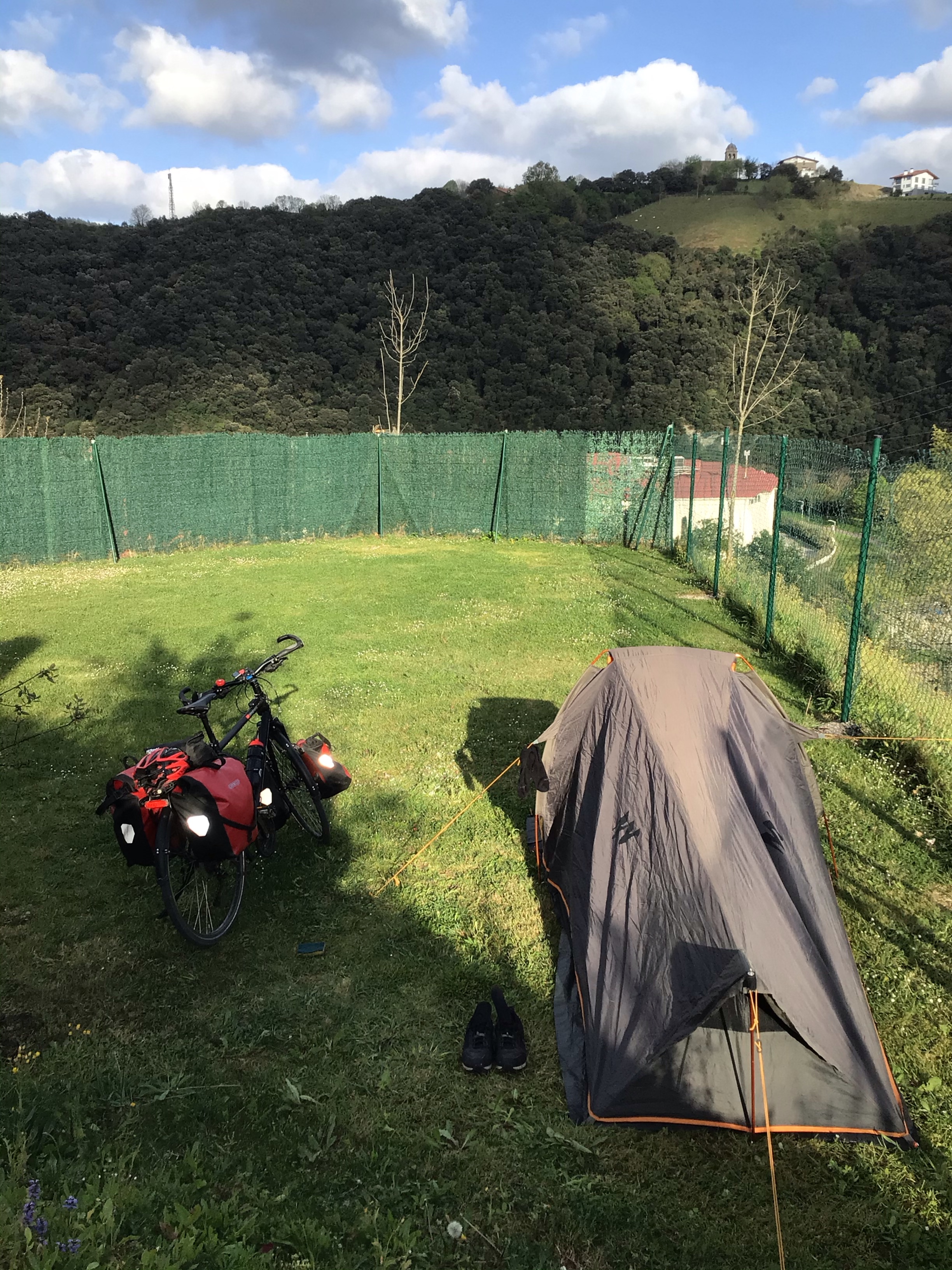 Il est 17h00 et il faut que je commence à me soucier de mon hébergement. Pas de évident de trouver un bivouac avec l’océan sur ma droite et la montagne sur ma gauche et pas forcément envie de grimper le peu de chemins qui s’enfoncent dans les hauteurs. Je finis par arriver à Zumaia où je repère un camping sur ma carte Maps.me. Ce sera parfait pour ce soir. J’ai les cuisses à nouveau explosées, la température n’est que de 14°C avec toujours ce vent froid. Et j’ai donc envie d’une bonne douche chaude pour me revigorer. Ainsi que d’une bonne bière fraîche pour me récompenser de mes belles grimpettes ! Je m’installe sur l’emplacement des tentes … où il n’y pas grand monde alors que le camping est complet. C’est étonnant !