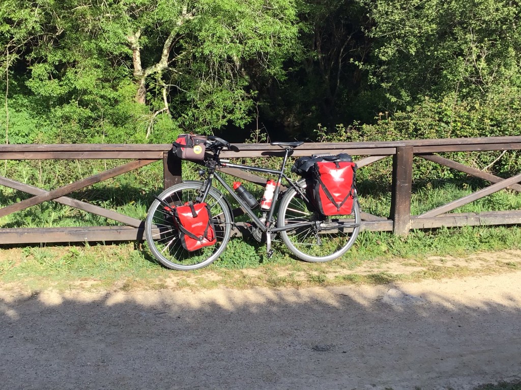 Il est temps de reprendre la route. Cependant, j’ai concocté une trace qui évite La Corogne. Je n’ai vraiment pas envie de me taper la traversée de cette grande ville, ni des grands axes qui la desservent. Je suis donc scrupuleusement mon GPS qui me fait tournicoter, monter et descendre au sud de « A Coruna ». La trace me fait passer par un charmant chemin qui longe une petite rivière. C’est plat et roulant. Personne. Que le chant des oiseaux et de l’eau qui ruisselle. J’aurais aimé que ce chemin soit encore plus long …