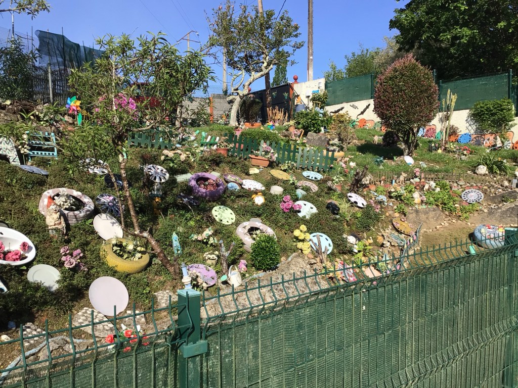 Je traverse en « ligne droite » et arrive en-dessous l’aéroport à Culleredo où je m’arrête pour ma pause café-scribe. Auparavant, j’ai aperçu un drôle de jardin. Je n’avais encore jamais vu cela. Ce jardin est parsemé de pneus et d’enjoliveurs peints. Peut-être un garagiste à la retraite qui a la nostalgie de son boulot …