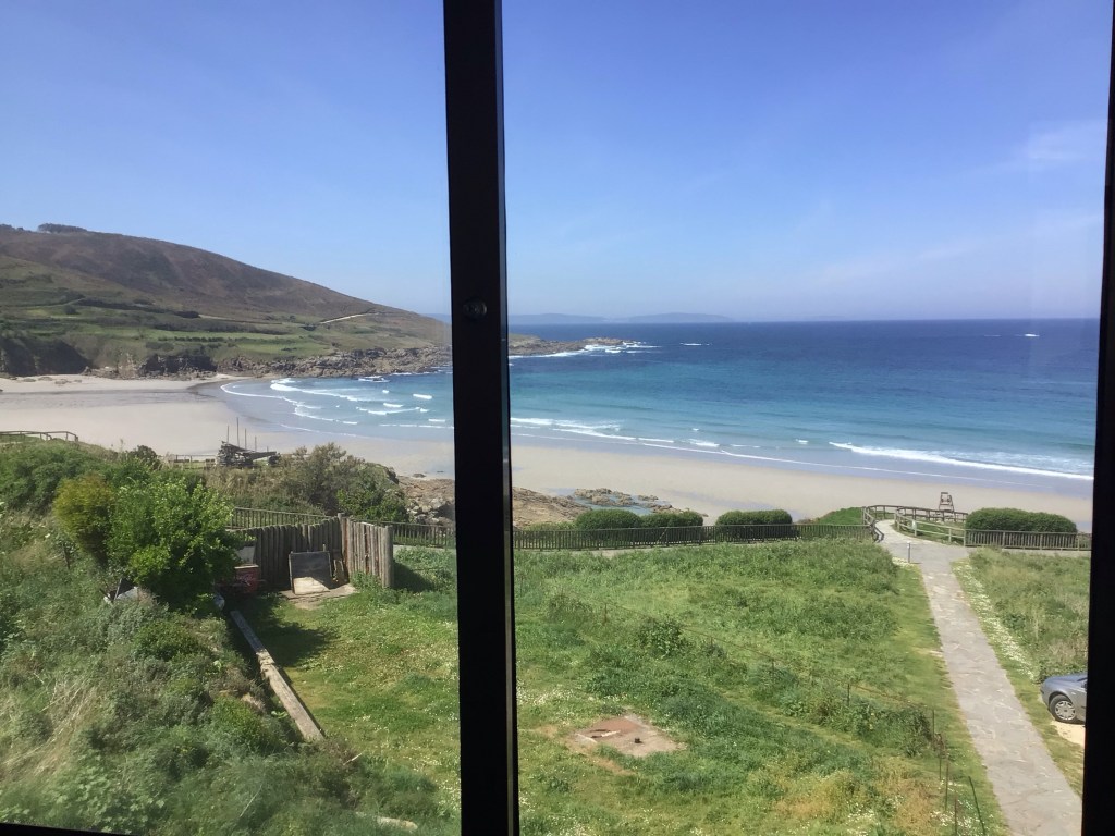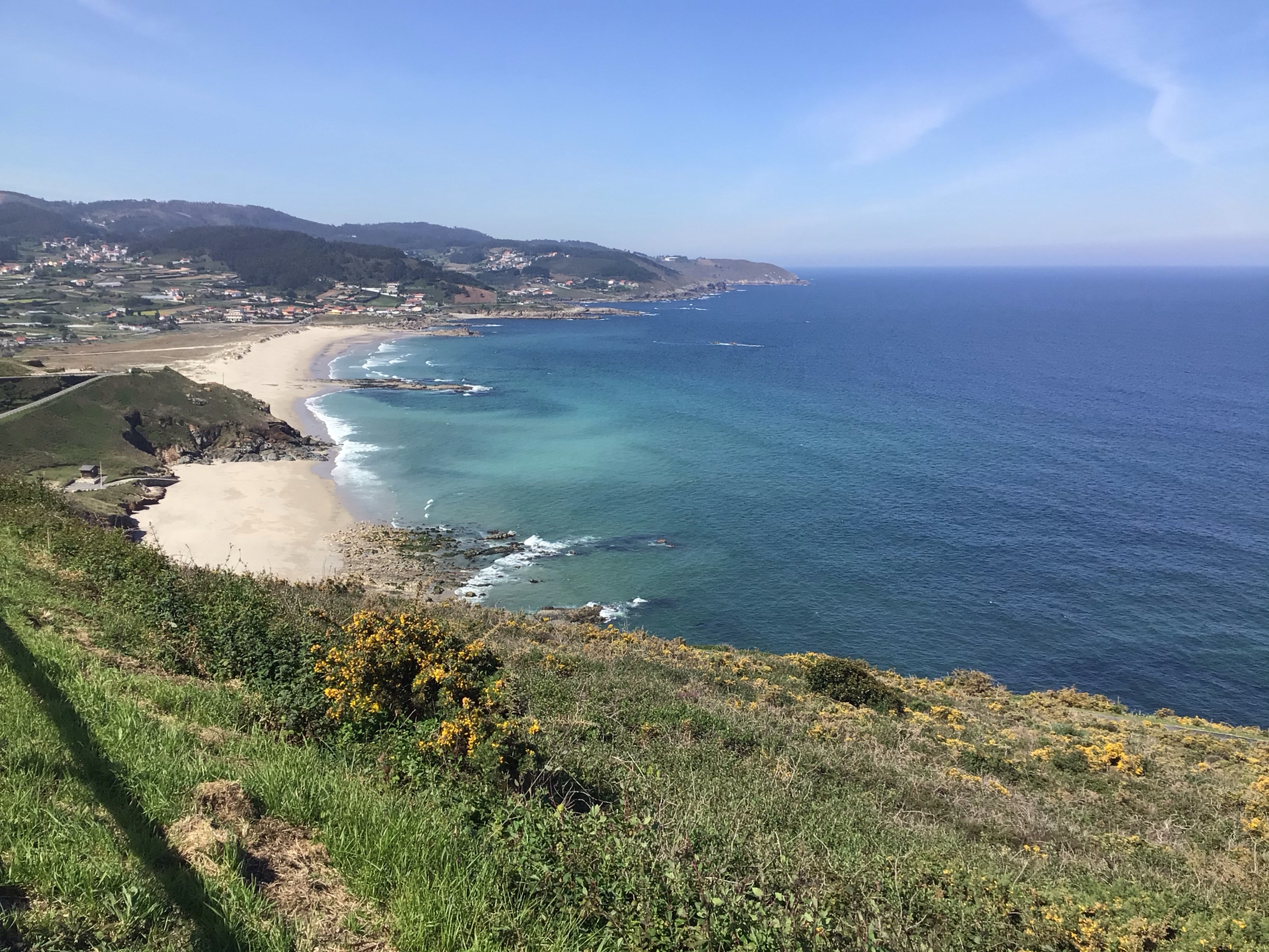 Je poursuis ma route en traversant direct par la route AC-419 puis en empruntant un chemin côtier qui longe la baie. J’arrive enfin à Laxe où je me pose pour boire une bonne Estrella Galicia bien méritée ! Là, des petits vieux me demandent où se trouvent le moteur sur le vélo (le syndrome Armstrong ?). Je leur montre mes cuissous. Et cela les fait beaucoup rire … Je file ensuite vers le phare où j’espère trouver un endroit calme et sympa. Trouvé avec vue superbe sur le cap Fisterra où j’espère passer demain.