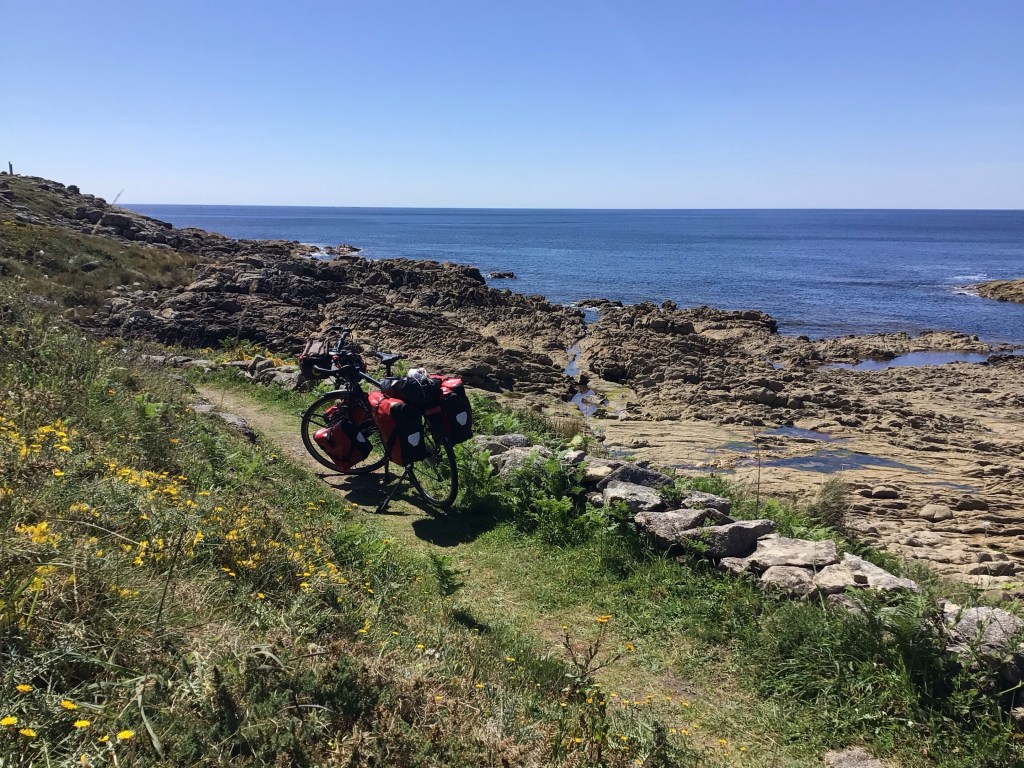 Comme tous les jours depuis mon passage en Espagne, ça monte et ça descend. Par contre, cette fois-ci, je dois aussi composer avec le vent tempétueux. D’ailleurs, ça moutonne sacrément en mer. Dans les montées terrestres, il est parfois compliqué de rester sur la bande d’urgence que j’utilise fréquemment. Je suis balayé et peine parfois à avancer ! Dans les descentes vent de face, j’atteins péniblement les 25km/h. Et puis, parfois, les baies abritées ne sont pas terribles non plus …
