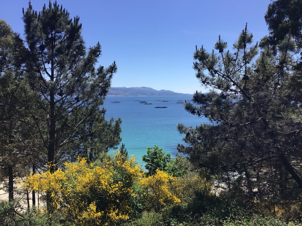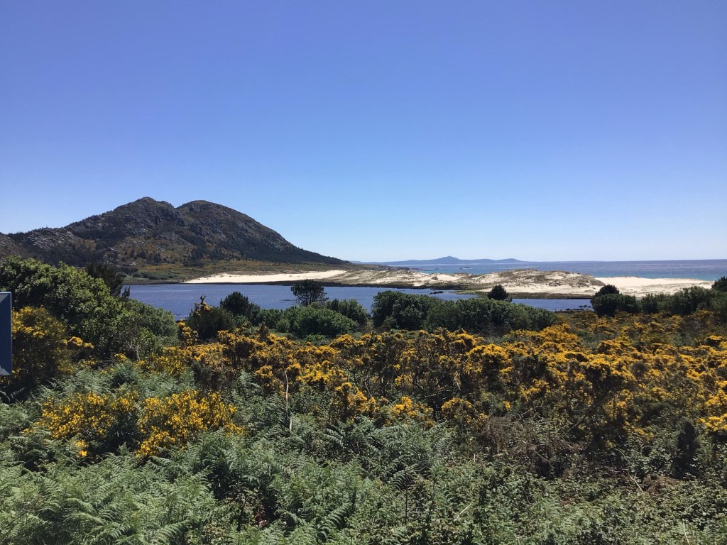 J’arrive ensuite dans le Consello de Carnota en-dessous de la péninsule de Fisterra. Les collines s’adoucissent. La végétation luxuriante fait place à de grandes étendues de genêts et de gros blocs de granits. Les pins refont leur apparition. Le vent s’apaise également. Le soleil frappe fort. J’ai l’impression d’avoir basculé du côté méditerranéen ! Je m’arrête pour casser la croûte en bordure de mer dans un cadre à nouveau idyllique.