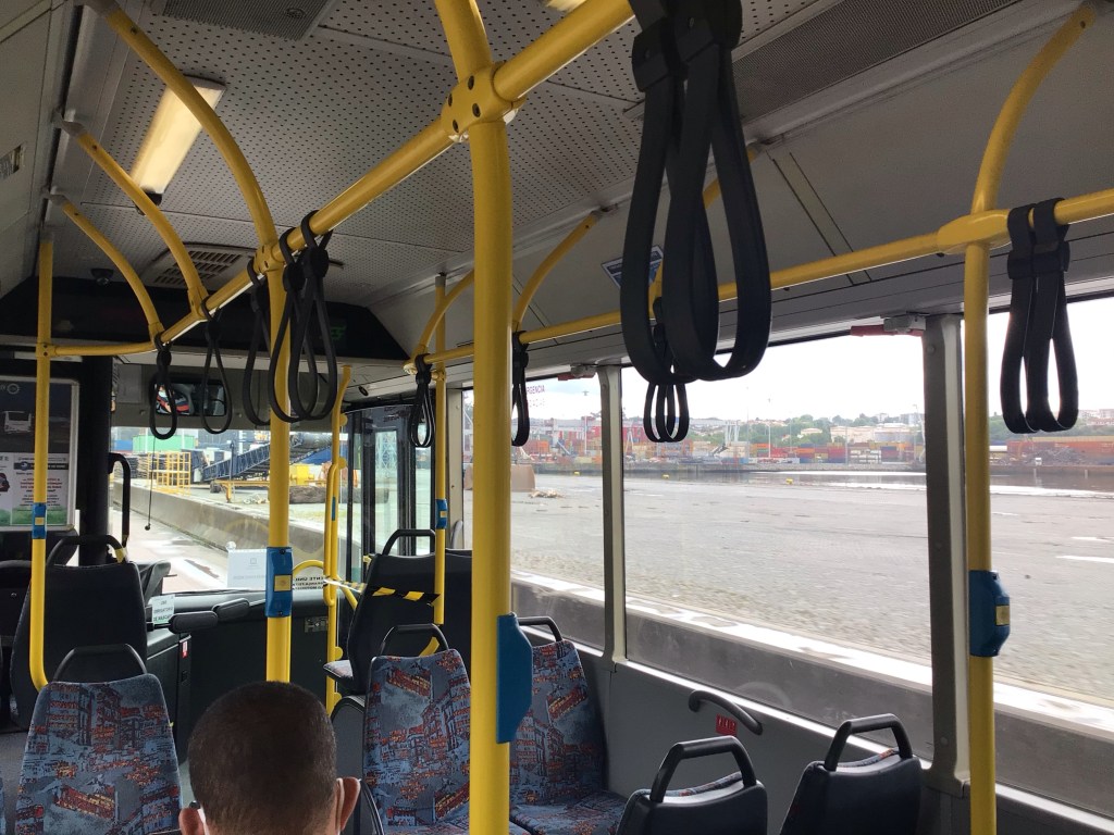 Je demande alors aux passants comment traverser sans ce pont. Un homme me dit qu’il faut prendre un bus et m’indique l’arrêt. J’emprunte donc ce bus qui contourne la zone portuaire. Puis m’arrête prendre mon café matinal alors que le crachin s’est mis à tomber.