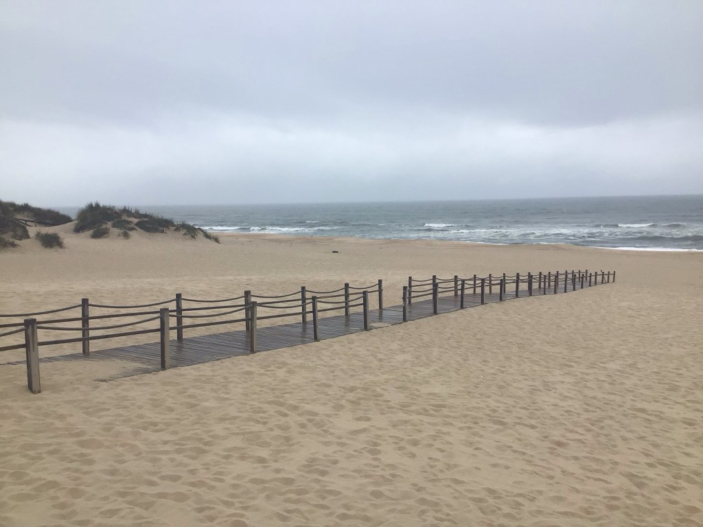 De plus, je me prends le déluge et, évidemment, aucun endroit pour m’abriter. Vers 13h00, je me rapproche de Praia de Mira pour déjeuner dans un petit restau en bord de mer tenu par un jeune couple très sympa. J’y déguste un poisson accompagné de pommes de terre, carottes, tomates et salade sans oublier un bon verre de vin. Et pour finir un café accompagné d’un Pasteis de Nata. Le tout pour 8,10€. Quel régal après cette mâtinée ô combien humide. Comme mes vêtements d’ailleurs mais il me faut repartir. Je pense qu’il faut quand même être légèrement taré. D’ailleurs, provenant de l’autre côté de cette passerelle au-delà des océans, je reçois une vidéo du fiston de Montréal où … il neige !