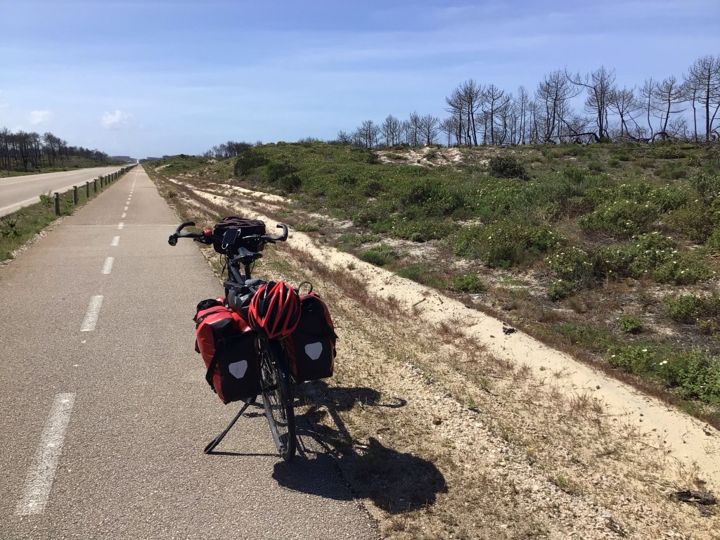 Je suis obligé de reprendre la route N109 détestée pendant 7 à 8 kms puis je bifurque à droite pour revenir vers l’océan. Après la circulation intense de ce jeudi matin et ces poids-lourds chargés de pins me frôlant sans ralentir, je retrouve la tranquillité de ces landes dévastées par l’incendie de ??? Les pins morts, dont je parlais hier, sont en fait calcinés. Je circule à nouveau sur une Ciclovia, piste cyclable rouge en dehors de la circulation, et j’arrive vers 11h en bord de mer dans la station balnéaire de Pedrogao. C’est quand même beaucoup plus agréable quand le soleil est de la partie. Mais les mauvaises conditions météo font aussi partie du périple et il faut l’accepter. Et puis, il faut bien qu’il pleuve pour arroser les cultures !