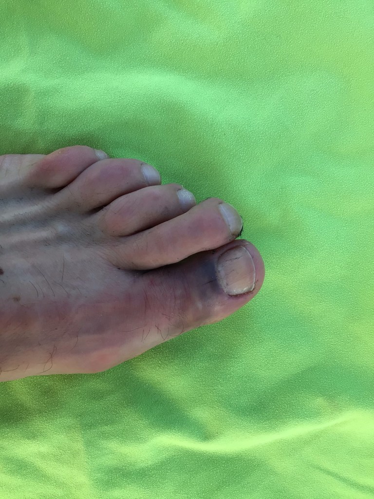 Par contre, ce qui est moins parfait, c’est l’état de mon orteil. Il est bien pété vu l’état bleuâtre du bestiaux. Mais bon, cela aurait pu être pire. J’aurais pu me péter un genou ou le bras ou je-ne-sais-quoi. Pour pédaler, cela devrait le faire. Cela me rappelle d’ailleurs deux anecdotes. La première en jouant au foot, pieds nus sur la plage, avec des allemands (remake de France-RFA 1982) et le fiston. J’avais voulu contrer un ballon. Mais crac. Mon fils m’avait traité de chochotte. Et le lendemain quand je lui avais montré l’état de l’orteil, il me chambrait moins : tout bleu, doublé de volume et triple fracture ! Heureusement, c’était la fin des vacances. La seconde en sortant de la piscine à Blagnac. J’avais voulu faire comme les pros en m’appuyant sur le rebord du bassin et en filant un battement de jambes pour remonter hors de l’eau. Mais j’avais shooté sur la margelle. Et un autre orteil fracturé … ce qui avait beaucoup amusé les maîtres-nageuses. Moi moins !