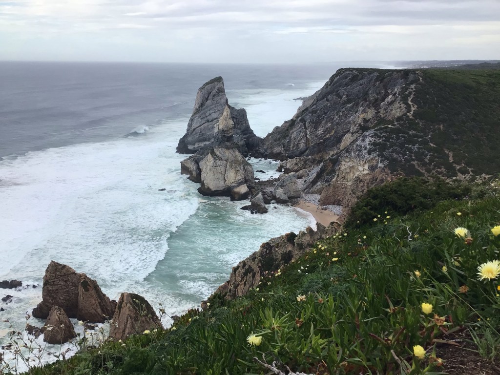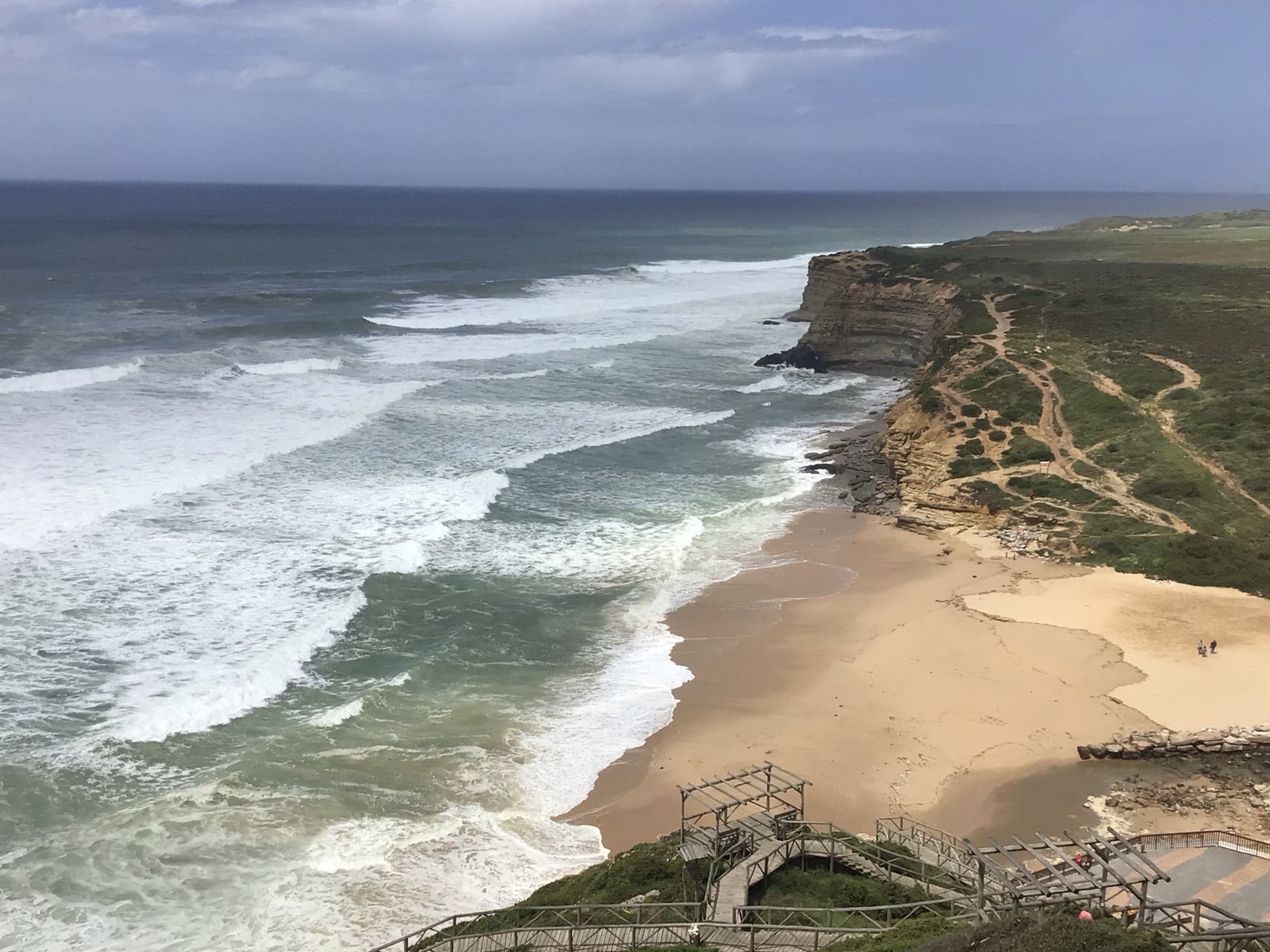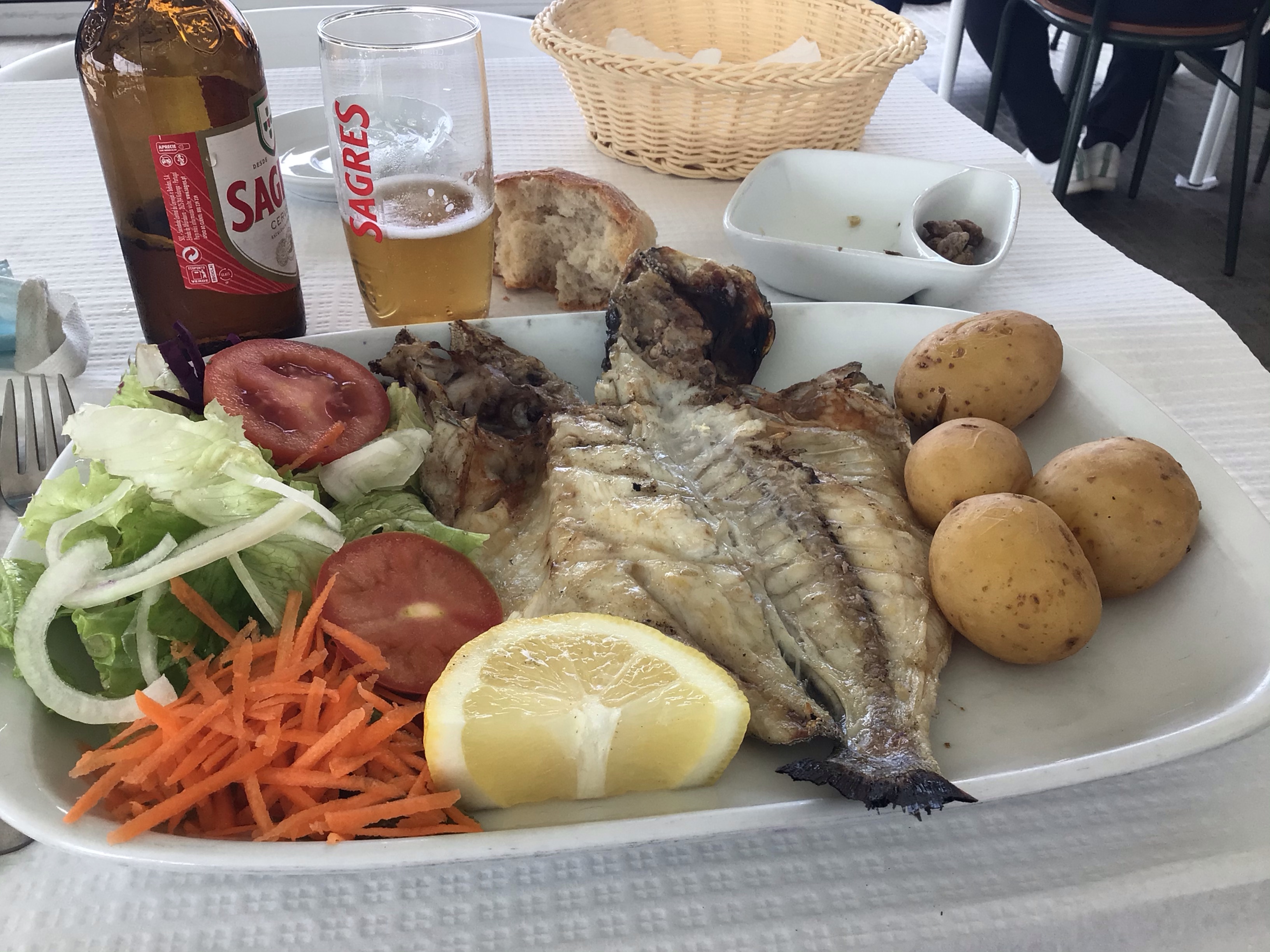 Après 3 heures de vélo à monter / descendre vent dans le pif, je commence à avoir faim. Je repère des restaurants mais qui m’ont l’air un peu trop chic vu les voitures garées devant. Finalement, j’en dégote un plus abordable et me trouve une place avec vue sur mer. Je me commande une dorade grillée que je déguste après avoir pris le traditionnel apéro portugais : beurre, pain et olives. Une mousse au chocolat et un café pour bien finir. Le tout pour 12,30€ !